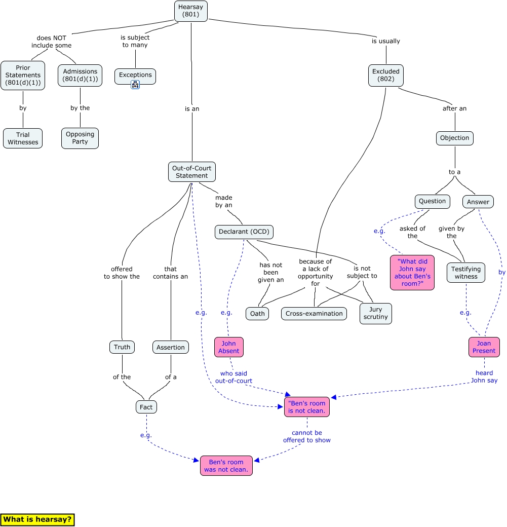 This Concept Map, created with IHMC CmapTools, has information related to: 800 Hearsay, Joan Present heard John say "Ben's room is not clean., Excluded (802) because of a lack of opportunity for Jury scrutiny, Truth of the Fact, Question asked of the Testifying witness, Out-of-Court Statement offered to show the Truth, Excluded (802) because of a lack of opportunity for Oath, Excluded (802) because of a lack of opportunity for Cross-examination, Prior Statements (801(d)(1)) by Trial Witnesses, Objection to a Question, Answer given by the Testifying witness, Assertion of a Fact, Declarant (OCD) is not subject to Jury scrutiny, Hearsay (801) is usually Excluded (802), Out-of-Court Statement that contains an Assertion, Question e.g. "What did John say about Ben's room?", Admissions (801(d)(1)) by the Opposing Party, Hearsay (801) is subject to many Exceptions, Answer by Joan Present, Fact e.g. Ben's room was not clean., Hearsay (801) is an Out-of-Court Statement