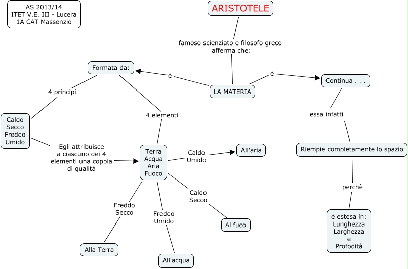 Questa Cmap, creata con IHMC CmapTools, contiene informazioni relative a: ARISTOTELE, LA MATERIA è Formata da:, Formata da: 4 elementi Terra Acqua Aria Fuoco, Formata da: 4 principi Caldo Secco Freddo Umido, Riempie completamente lo spazio perchè è estesa in: Lunghezza Larghezza e Profodità, LA MATERIA è Continua . . ., Continua . . . essa infatti Riempie completamente lo spazio, Terra Acqua Aria Fuoco Caldo Secco Al fuco, Terra Acqua Aria Fuoco Freddo Secco Alla Terra, Caldo Secco Freddo Umido Egli attribuisce a ciascuno dei 4 elementi una coppia di qualità Terra Acqua Aria Fuoco, Terra Acqua Aria Fuoco Caldo Umido All'aria, ARISTOTELE famoso scienziato e filosofo greco afferma che: LA MATERIA, Terra Acqua Aria Fuoco Freddo Umido All'acqua