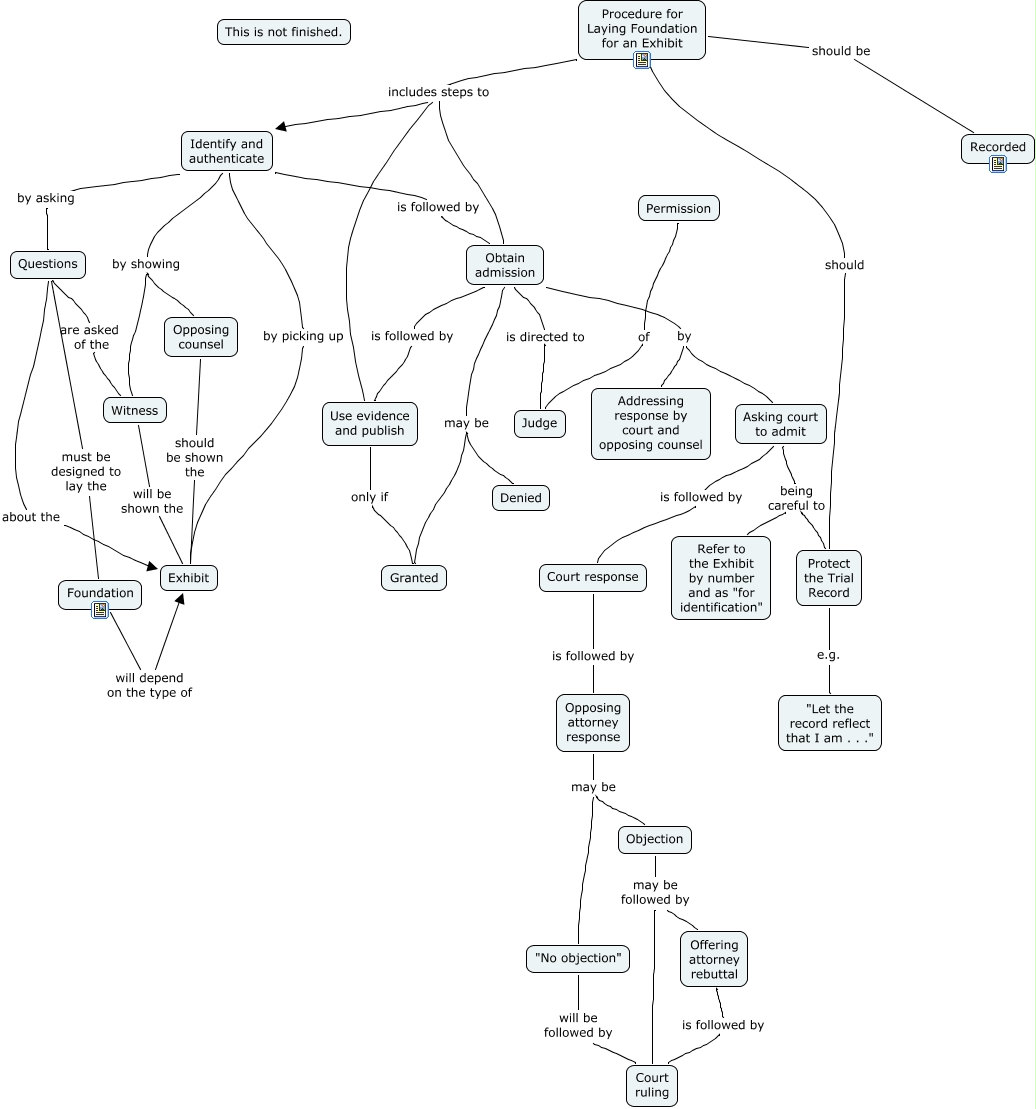 This Concept Map, created with IHMC CmapTools, has information related to: 904 Introducing exhibit, Asking court to admit being careful to Refer to the Exhibit by number and as "for identification", Asking court to admit being careful to Protect the Trial Record, Obtain admission may be Denied, "No objection" will be followed by Court ruling, Offering attorney rebuttal is followed by Court ruling, Procedure for Laying Foundation for an Exhibit should Protect the Trial Record, Identify and authenticate by showing Witness, Procedure for Laying Foundation for an Exhibit includes steps to Identify and authenticate, Protect the Trial Record e.g. "Let the record reflect that I am . . .", Questions must be designed to lay the Foundation, Obtain admission is followed by Use evidence and publish, Procedure for Laying Foundation for an Exhibit includes steps to Obtain admission, Opposing counsel should be shown the Exhibit, Questions are asked of the Witness, Obtain admission by Asking court to admit, Questions about the Exhibit, Objection may be followed by Court ruling, Identify and authenticate is followed by Obtain admission, Procedure for Laying Foundation for an Exhibit includes steps to Use evidence and publish, Permission of Judge