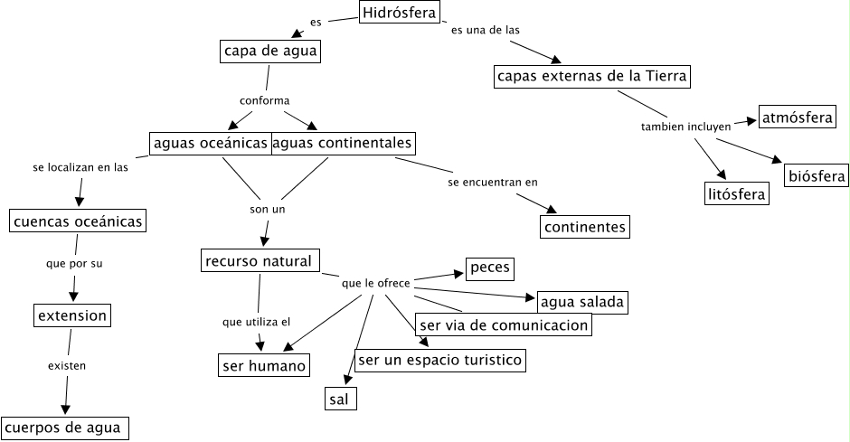 Este Cmap, tiene información relacionada con: HIDROSFERA, ser via de comunicacion que le ofrece peces, Hidrósfera es una de las capas externas de la Tierra, capas externas de la Tierra tambien incluyen biósfera, recurso natural que le ofrece agua salada, ser via de comunicacion que le ofrece agua salada, recurso natural que le ofrece ser un espacio turistico, recurso natural que utiliza el ser humano, capa de agua conforma aguas oceánicas, cuencas oceánicas que por su extension, capa de agua conforma aguas continentales, extension existen cuerpos de agua, aguas oceánicas son un recurso natural, capas externas de la Tierra tambien incluyen atmósfera, recurso natural que le ofrece peces, Hidrósfera es capa de agua, recurso natural que le ofrece ser humano, aguas continentales se encuentran en continentes, aguas oceánicas se localizan en las cuencas oceánicas, ser via de comunicacion que le ofrece ser un espacio turistico, capas externas de la Tierra tambien incluyen litósfera