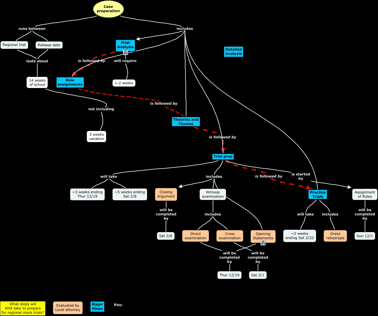 This Concept Map, created with IHMC CmapTools, has information related to: Case preparation, Witness examination includes Direct examination, Case preparation includes Role assignments, Assignment of Roles will be completed by Sun 12/1, Closing Argument will be completed by Sat 2/8, Release date lasts about 14 weeks of school, Case preparation includes Practice Trials, 14 weeks of school not including 3 weeks vacation, Trial prep will take ~5 weeks ending Sat 2/8, Case preparation includes Theories and Themes, First Analysis will require 1-2 weeks, Cross examination will be completed by Sat 2/1, Opening Statements will be completed by Thur 12/19, Role assignments is followed by Theories and Themes, Case preparation runs between Release date, Regional trial lasts about 14 weeks of school, Direct examination will be completed by Thur 12/19, Practice Trials will take ~2 weeks ending Sat 2/22, Trial prep includes Closing Argument, Case preparation includes Trial prep, Trial prep includes Opening Statements