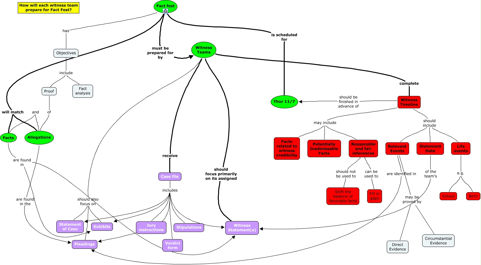 This Concept Map, created with IHMC CmapTools, has information related to: Preparation for Fact fest, Fact fest has Objectives, Witness Timeline should include Life events, Witness Teams should focus primarily on its assigned Witness Statement(s), Witness Timeline may include Facts related to witness credibility, Witness Teams receive Case file, Witness Timeline should be finished in advance of Thur 11/7, Case file includes Pleadings, Fact fest is scheduled for Thur 11/7, Witness Timeline should include Statement Date, Witness Teams should also focus on Exhibits, Life events e.g. School, Case file includes Jury instructions, Proof of Allegations, Witness Teams complete Witness Timeline, Reasonable and fair inferences should not be used to Shift the balance of favorable facts, Case file includes Statement of Case, Case file includes Exhibits, Reasonable and fair inferences can be used to Fill in gaps, Facts are found in Exhibits, Facts are found in Witness Statement(s)