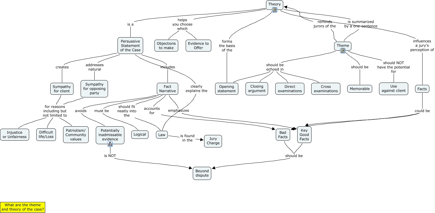 This Concept Map, created with IHMC CmapTools, has information related to: Theory and Theme, Fact Narrative should fit neatly into the Law, Theory is a Persuasive Statement of the Case, Potentially inadmissable evidence is NOT Beyond dispute, Fact Narrative must be Logical, Fact Narrative emphasizes Key Good Facts, Persuasive Statement of the Case includes Fact Narrative, Bad Facts should be Beyond dispute, Facts could be Key Good Facts, Fact Narrative avoids Potentially inadmissable evidence, Theme should be echoed in Cross examinations, Theme should be echoed in Opening statement, Theory influences a jury's perception of Facts, Key Good Facts should be Beyond dispute, Sympathy for client for reasons including but not limited to Injustice or Unfairness, Sympathy for opposing party for reasons including but not limited to Difficult life/Loss, Sympathy for opposing party for reasons including but not limited to Patriotism/ Community values, Facts could be Bad Facts, Sympathy for client for reasons including but not limited to Patriotism/ Community values, Persuasive Statement of the Case clearly explains the Law, Persuasive Statement of the Case addresses natural Sympathy for opposing party