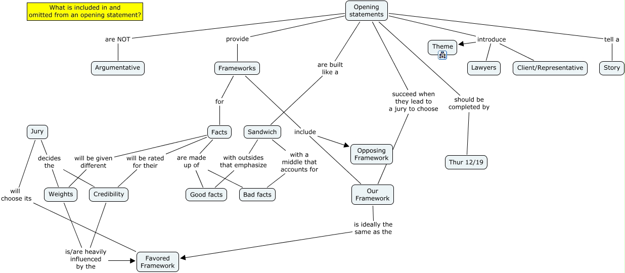 This Concept Map, created with IHMC CmapTools, has information related to: Opening statements, Frameworks for Facts, Opening statements introduce Client/Representative, Weights is/are heavily influenced by the Favored Framework, Facts will be given different Weights, Facts are made up of Good facts, Credibility is/are heavily influenced by the Favored Framework, Sandwich with a middle that accounts for Bad facts, Opening statements succeed when they lead to a jury to choose Our Framework, Jury will choose its Favored Framework, Sandwich with outsides that emphasize Good facts, Frameworks include Our Framework, Opening statements provide Frameworks, Opening statements introduce Theme, Our Framework is ideally the same as the Favored Framework, Opening statements should be completed by Thur 12/19, Facts will be rated for their Credibility, Frameworks include Opposing Framework, Facts are made up of Bad facts, Opening statements introduce Lawyers, Opening statements tell a Story