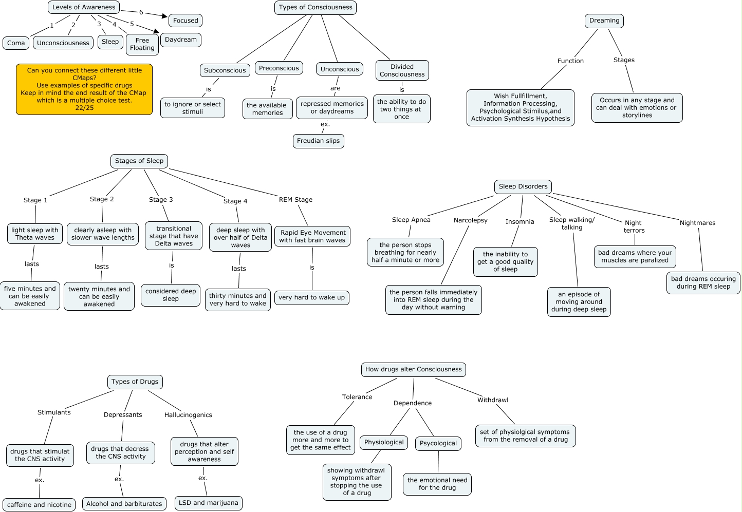 This Concept Map, created with IHMC CmapTools, has information related to: Fiol Ch-4 22, Stages of Sleep Stage 2 clearly asleep with slower wave lengths, drugs that alter perception and self awareness ex. LSD and marijuana, Subconscious ???? Types of Consciousness, Sleep Disorders Narcolepsy the person falls immediately into REM sleep during the day without warning, Divided Consciousness is the ability to do two things at once, Levels of Awareness 5 Daydream, Stages of Sleep REM Stage Rapid Eye Movement with fast brain waves, Dreaming Stages Occurs in any stage and can deal with emotions or storylines, Stages of Sleep Stage 3 transitional stage that have Delta waves, Sleep Disorders Nightmares bad dreams occuring during REM sleep, How drugs alter Consciousness Withdrawl set of physiolgical symptoms from the removal of a drug, Levels of Awareness 2 Unconsciousness, Sleep Disorders Sleep walking/ talking an episode of moving around during deep sleep, Levels of Awareness 4 Free Floating, Psycological ???? the emotional need for the drug, Types of Consciousness ???? Divided Consciousness, Stages of Sleep Stage 4 deep sleep with over half of Delta waves, Types of Consciousness ???? Preconscious, Levels of Awareness 3 Sleep, Sleep Disorders Night terrors bad dreams where your muscles are paralized