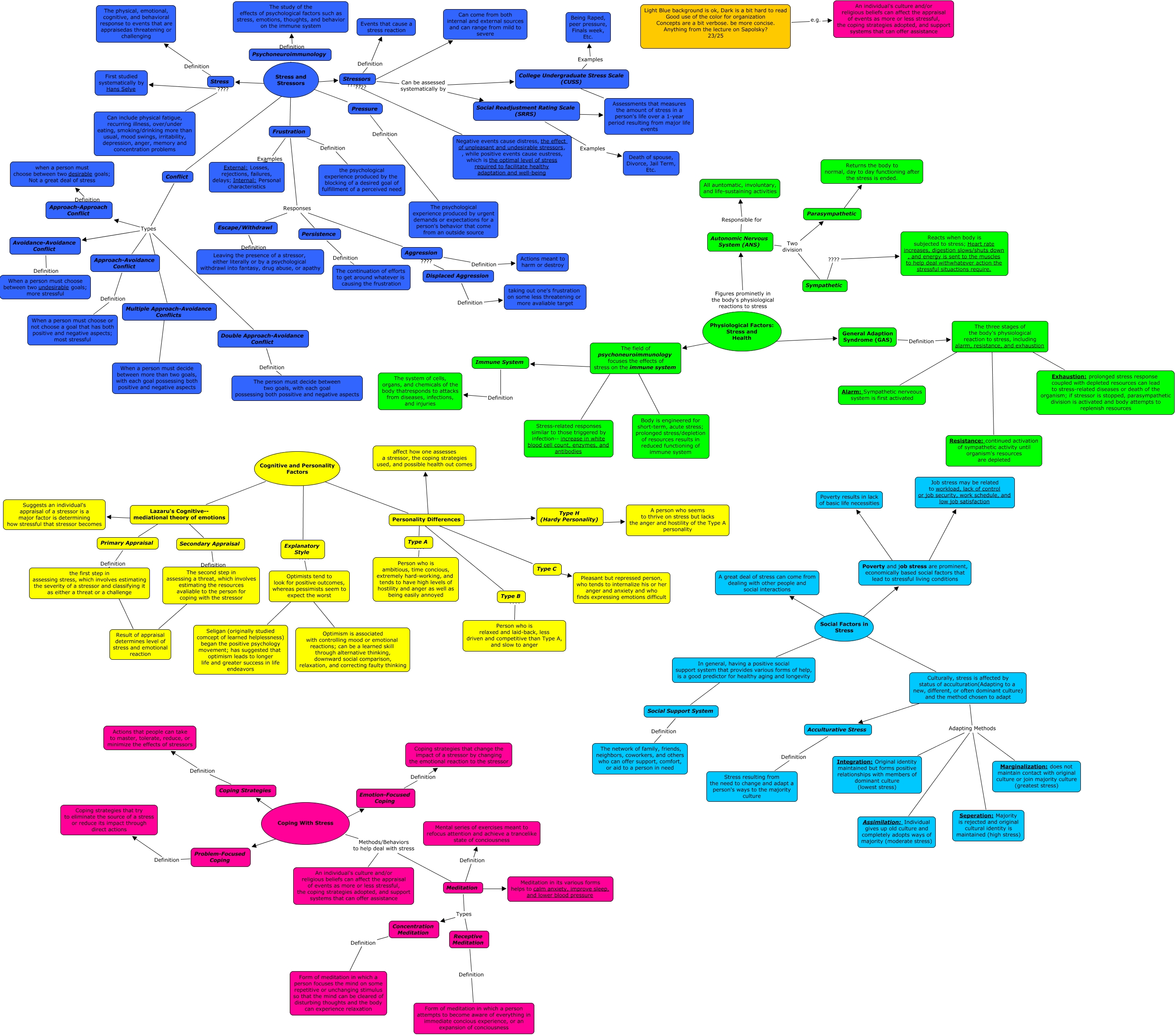 This Concept Map, created with IHMC CmapTools, has information related to: Draper-Ch 11 23, Coping With Stress ???? Coping Strategies, Coping With Stress Methods/Behaviors to help deal with stress Meditation, Cognitive and Personality Factors ???? Personality Differences, Type B ???? Person who is relaxed and laid-back, less driven and competitive than Type A, and slow to anger, Social Factors in Stress ???? A great deal of stress can come from dealing with other people and social interactions, Conflict Types Approach-Avoidance Conflict, Frustration Examples External: Losses, rejections, failures, delays; Internal: Personal characteristics, Conflict Types Multiple Approach-Avoidance Conflicts, Social Factors in Stress ???? Poverty and job stress are prominent, economically based social factors that lead to stressful living conditions, In general, having a positive social support system that provides various forms of help, is a good predictor for healthy aging and longevity ???? Social Support System, Frustration Responses Escape/Withdrawl, Culturally, stress is affected by status of acculturation(Adapting to a new, different, or often dominant culture) and the method chosen to adapt ???? Acculturative Stress, Stress and Stressors ???? Conflict, Type C ???? Pleasant but repressed person, who tends to internalize his or her anger and anxiety and who finds expressing emotions difficult, Culturally, stress is affected by status of acculturation(Adapting to a new, different, or often dominant culture) and the method chosen to adapt Adapting Methods Integration: Original identity maintained but forms positive relationships with members of dominant culture (lowest stress), Lazaru's Cognitive-- mediational theory of emotions ???? Suggests an individual's appraisal of a stressor is a major factor is determining how stressful that stressor becomes, Cognitive and Personality Factors ???? Lazaru's Cognitive-- mediational theory of emotions, Coping With Stress ???? Problem-Focused Coping, Persistence Definition The continuation of efforts to get around whatever is causing the frustration, Type A ???? Person who is ambitious, time concious, extremely hard-working, and tends to have high levels of hostility and anger as well as being easily annoyed