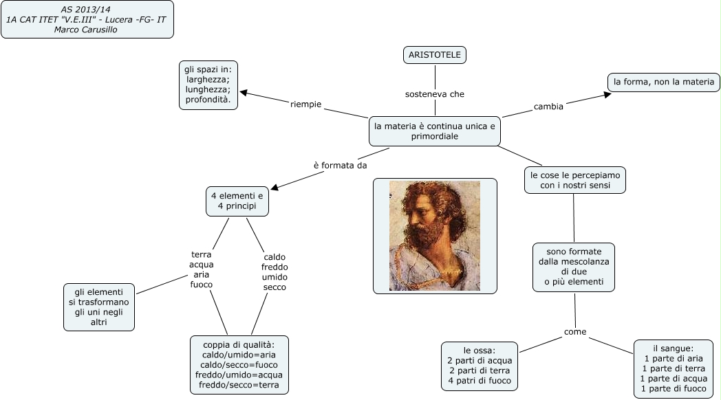 Questa Cmap, creata con IHMC CmapTools, contiene informazioni relative a: La materia secondo Aristotele, 4 elementi e 4 principi caldo freddo umido secco coppia di qualità: caldo/umido=aria caldo/secco=fuoco freddo/umido=acqua freddo/secco=terra, sono formate dalla mescolanza di due o più elementi come il sangue: 1 parte di aria 1 parte di terra 1 parte di acqua 1 parte di fuoco, le cose le percepiamo con i nostri sensi . sono formate dalla mescolanza di due o più elementi, coppia di qualità: caldo/umido=aria caldo/secco=fuoco freddo/umido=acqua freddo/secco=terra terra acqua aria fuoco gli elementi si trasformano gli uni negli altri, ARISTOTELE sosteneva che la materia è continua unica e primordiale, la materia è continua unica e primordiale è formata da 4 elementi e 4 principi, 4 elementi e 4 principi terra acqua aria fuoco gli elementi si trasformano gli uni negli altri, la materia è continua unica e primordiale le cose le percepiamo con i nostri sensi, la materia è continua unica e primordiale cambia la forma, non la materia, sono formate dalla mescolanza di due o più elementi come le ossa: 2 parti di acqua 2 parti di terra 4 patri di fuoco, la materia è continua unica e primordiale riempie gli spazi in: larghezza; lunghezza; profondità.