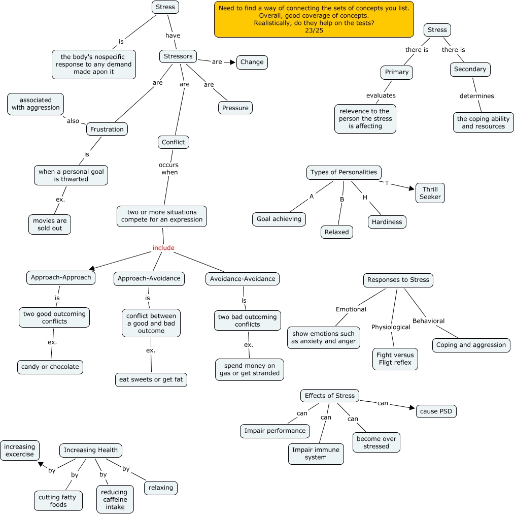 This Concept Map, created with IHMC CmapTools, has information related to: Fiol-ch-11 23, when a personal goal is thwarted ex. movies are sold out, Increasing Health by increasing excercise, two or more situations compete for an expression include Approach-Avoidance, Avoidance-Avoidance is two bad outcoming conflicts, Stress there is Secondary, Frustration also associated with aggression, Effects of Stress can cause PSD, Stressors are Frustration, two bad outcoming conflicts ex. spend money on gas or get stranded, Increasing Health by reducing caffeine intake, two good outcoming conflicts ex. candy or chocolate, Stress there is Primary, two or more situations compete for an expression include Approach-Approach, Types of Personalities B Relaxed, Approach-Approach is two good outcoming conflicts, Responses to Stress Physiological Fight versus Fligt reflex, Conflict occurs when two or more situations compete for an expression, conflict between a good and bad outcome ex. eat sweets or get fat, Types of Personalities A Goal achieving, Stressors are Conflict