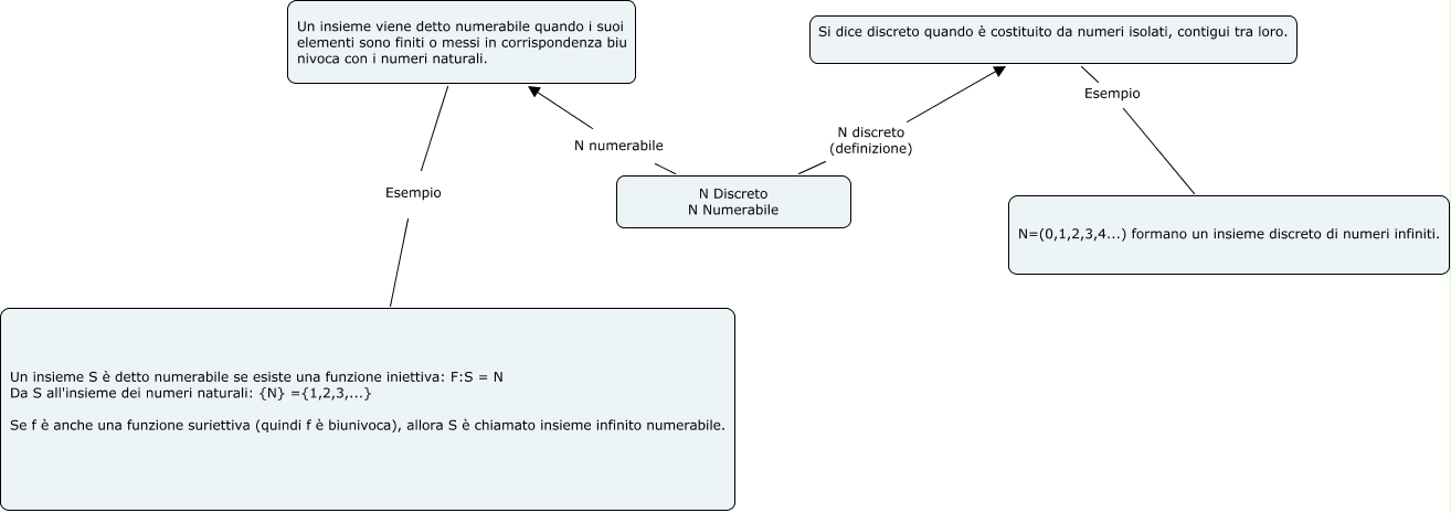 Questa Cmap, creata con IHMC CmapTools, contiene informazioni relative a: Asfaha Denise e Bermudez Manuel, N Discreto N Numerabile N discreto (definizione) Si dice discreto quando è costituito da numeri isolati, contigui tra loro., N Discreto N Numerabile N numerabile Un insieme viene detto numerabile quando i suoi elementi sono finiti o messi in corrispondenza biu nivoca con i numeri naturali., Si dice discreto quando è costituito da numeri isolati, contigui tra loro. Esempio N=(0,1,2,3,4...) formano un insieme discreto di numeri infiniti., Un insieme viene detto numerabile quando i suoi elementi sono finiti o messi in corrispondenza biu nivoca con i numeri naturali. Esempio Un insieme S è detto numerabile se esiste una funzione iniettiva: F:S = N Da S all'insieme dei numeri naturali: {N} ={1,2,3,...} Se f è anche una funzione suriettiva (quindi f è biunivoca), allora S è chiamato insieme infinito numerabile.