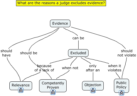 This Concept Map, created with IHMC CmapTools, has information related to: Excluding evidence, Evidence should not violate Public Policy, Excluded when it violates Public Policy, Excluded when not Competently Proven, Excluded only after an Objection, Evidence should have Relevance, Evidence should be Competently Proven, Evidence can be Excluded, Excluded because of a lack of Relevance