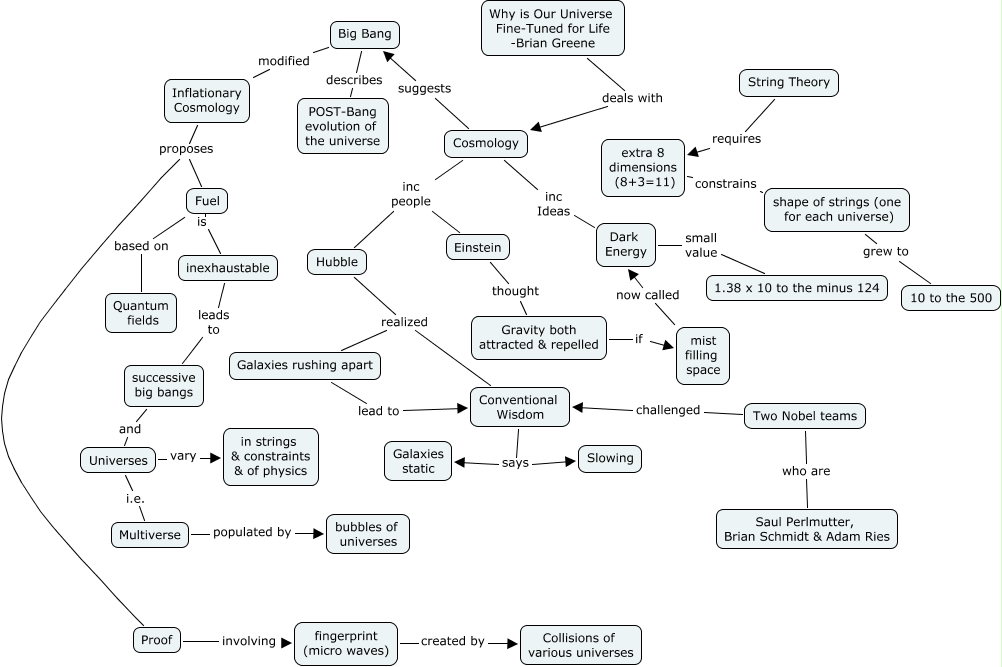 This Concept Map, created with IHMC CmapTools, has information related to: Greene - Life in the Cosmos, Inflationary Cosmology proposes Fuel, String Theory requires extra 8 dimensions (8+3=11), Inflationary Cosmology proposes Proof, Proof involving fingerprint (micro waves), extra 8 dimensions (8+3=11) constrains shape of strings (one for each universe), Conventional Wisdom says Slowing, Big Bang describes POST-Bang evolution of the universe, Conventional Wisdom says Galaxies static, Hubble realized Galaxies rushing apart, successive big bangs and Universes, shape of strings (one for each universe) grew to 10 to the 500, Fuel based on Quantum fields, Cosmology inc people Hubble, Two Nobel teams challenged Conventional Wisdom, Fuel is inexhaustable, Einstein thought Gravity both attracted & repelled, Gravity both attracted & repelled if mist filling space, Multiverse populated by bubbles of universes, Why is Our Universe Fine-Tuned for Life -Brian Greene deals with Cosmology, Hubble realized Conventional Wisdom