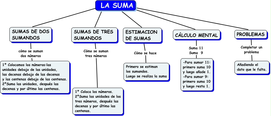 Este Cmap, tiene información relacionada con: LA SUMA, SUMAS DE DOS SUMANDOS cómo se suman dos números 1º Colocamos los números:las unidades debajo de las unidades, las decenas debajo de las decenas y las centenas debajo de las centenas. 2ºSuma las unidades, después las decenas y por último las centenas., PROBLEMAS Completar un problema Añadiendo el dato que le falta., LA SUMA ???? SUMAS DE TRES SUMANDOS, LA SUMA ???? SUMAS DE DOS SUMANDOS, LA SUMA ???? PROBLEMAS, CÁLCULO MENTAL Suma 11 Suma 9 -Para sumar 11: primero suma 10 y luego añade 1. -Para sumar 9: primero suma 10 y luego resta 1., LA SUMA ???? ESTIMACION DE SUMAS, ESTIMACION DE SUMAS Cómo se hace Primero se estiman los sumandos. Luego se realiza la suma, SUMAS DE TRES SUMANDOS Cómo se suman tres números 1º Coloca los números. 2ºSuma las unidades de los tres números, después las decenas y por último las centenas., LA SUMA ???? CÁLCULO MENTAL