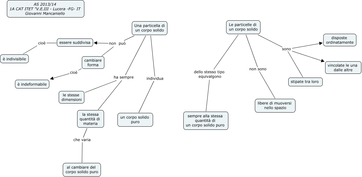 Questa Cmap, creata con IHMC CmapTools, contiene informazioni relative a: Le particelle di un corpo solido, cambiare forma cioè è indeformabile, Una particella di un corpo solido non può essere suddivisa, la stessa quantità di materia che varia al cambiare del corpo solido puro, Una particella di un corpo solido ha sempre la stessa quantità di materia, Le particelle di un corpo solido non sono libere di muoversi nello spazio, Le particelle di un corpo solido sono disposte ordinatamente, essere suddivisa cioè è indivisibile, Le particelle di un corpo solido dello stesso tipo equivalgono sempre alla stessa quantità di un corpo solido puro, Le particelle di un corpo solido sono vincolate le una dalle altre, Una particella di un corpo solido ha sempre le stesse dimensioni, Una particella di un corpo solido individua un corpo solido puro, Le particelle di un corpo solido sono stipate tra loro, Una particella di un corpo solido non può cambiare forma