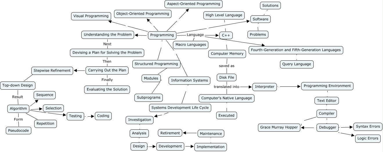 This Concept Map, created with IHMC CmapTools, has information related to: 3, Maintenance Retirement, Debugger Syntax Errors, Programming Language Fourth-Generation and Fifth-Generation Languages, Interpreter Programming Environment, Debugger Grace Murray Hopper, Stepwise Refinement ???? Top-down Design, Understanding the Problem Next Devising a Plan for Solving the Problem, Algorithm ??? Sequence, Carrying Out the Plan ???? Stepwise Refinement, Analysis Design, Disk File translated into Interpreter, Programming ???? Understanding the Problem, Programming Language Macro Languages, Algorithm Form Pseudocode, Programming Language C++, Algorithm ?? Selection, Systems Development Life Cycle Investigation, Computer's Native Language Executed, Software Problems, Compiler Grace Murray Hopper