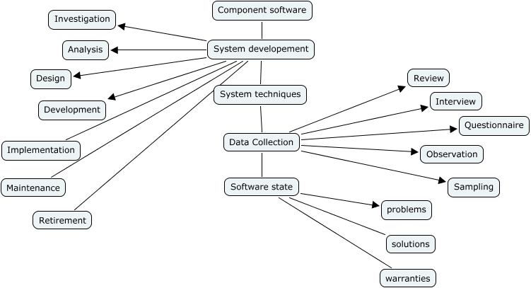 This Concept Map, created with IHMC CmapTools, has information related to: Chelle Streeter, System developement Implementation, Data Collection Software state, Component software System developement, System developement Retirement, System developement Maintenance, Software state warranties, System developement Development, System techniques Data Collection, Software state problems, System developement Investigation, Data Collection Observation, System developement Design, Software state solutions, Data Collection Questionnaire, Data Collection Review, Data Collection Interview, System developement System techniques, Data Collection Sampling, System developement Analysis