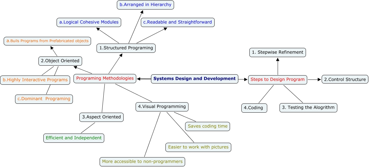 This Concept Map, created with IHMC CmapTools, has information related to: 4, 1.Structured Programing a.Logical Cohesive Modules, Steps to Design Program 4.Coding, Programing Methodologies 4.Visual Programming, Steps to Design Program 3. Testing the Alogrithm, 4.Visual Programming Easier to work with pictures, 2.Object Oriented b.Highly Interactive Programs, Systems Design and Development ???? Programing Methodologies, Programing Methodologies 1.Structured Programing, 2.Object Oriented c.Dominant Programing, Steps to Design Program 2.Control Structure, 1.Structured Programing b.Arranged in Hierarchy, Steps to Design Program 1. Stepwise Refinement, 1.Structured Programing c.Readable and Straightforward, 4.Visual Programming More accessible to non-programmers, 2.Object Oriented a.Buils Programs from Prefabricated objects, Programing Methodologies 2.Object Oriented, 4.Visual Programming Saves coding time, 3.Aspect Oriented Efficient and Independent, Programing Methodologies 3.Aspect Oriented, Programing Methodologies ???? Steps to Design Program