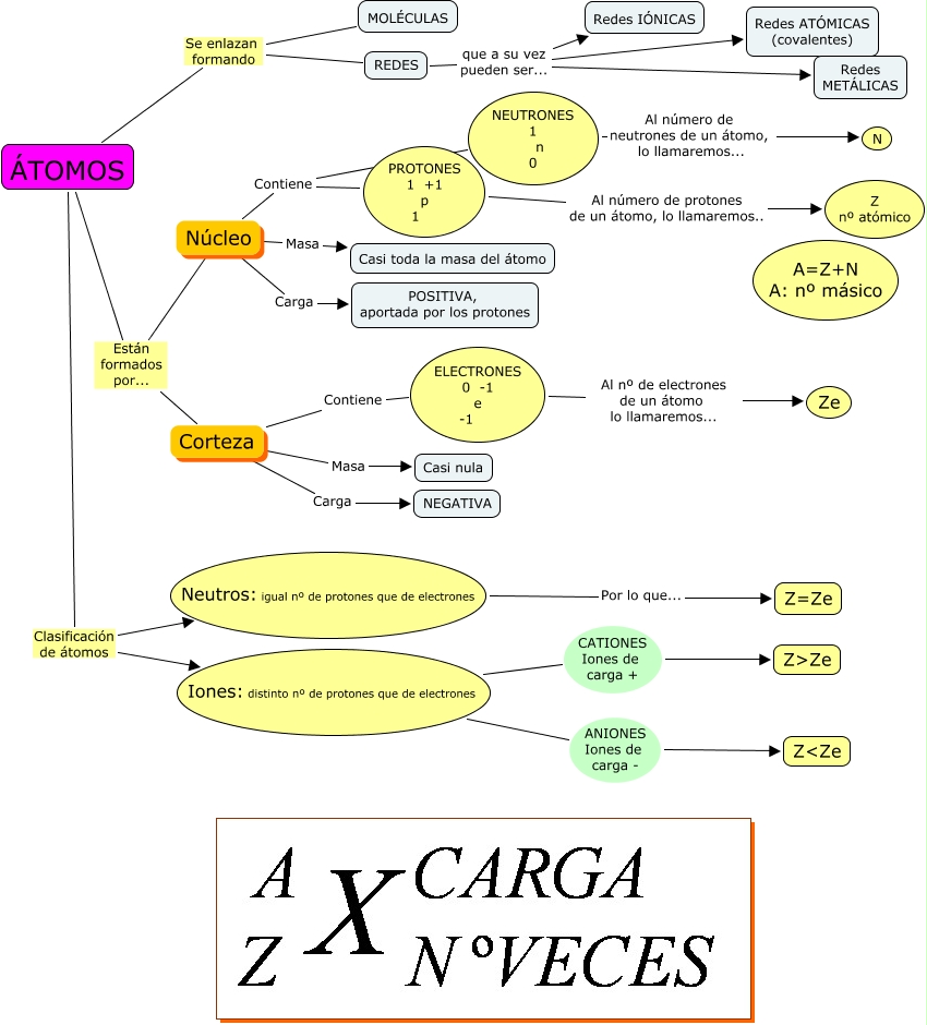 Este Cmap, tiene información relacionada con: Estructura atómica, Iones: distinto nº de protones que de electrones CATIONES Iones de carga + Z>Ze, PROTONES 1 +1 p 1 Contiene NEUTRONES 1 n 0, REDES que a su vez pueden ser... Redes IÓNICAS, ÁTOMOS Se enlazan formando REDES, ÁTOMOS Están formados por... Núcleo, NEUTRONES 1 n 0 Al número de neutrones de un átomo, lo llamaremos... N, PROTONES 1 +1 p 1 Al número de protones de un átomo, lo llamaremos.. Z nº atómico, REDES que a su vez pueden ser... Redes METÁLICAS, Corteza Contiene ELECTRONES 0 -1 e -1, ÁTOMOS Se enlazan formando MOLÉCULAS, Iones: distinto nº de protones que de electrones ANIONES Iones de carga - Z<Ze, Núcleo Contiene NEUTRONES 1 n 0, REDES que a su vez pueden ser... Redes ATÓMICAS (covalentes), Corteza Masa Casi nula, ÁTOMOS Clasificación de átomos Iones: distinto nº de protones que de electrones, Núcleo Carga POSITIVA, aportada por los protones, ÁTOMOS Clasificación de átomos Neutros: igual nº de protones que de electrones, Corteza Carga NEGATIVA, ELECTRONES 0 -1 e -1 Al nº de electrones de un átomo lo llamaremos... Ze, ÁTOMOS Están formados por... Corteza