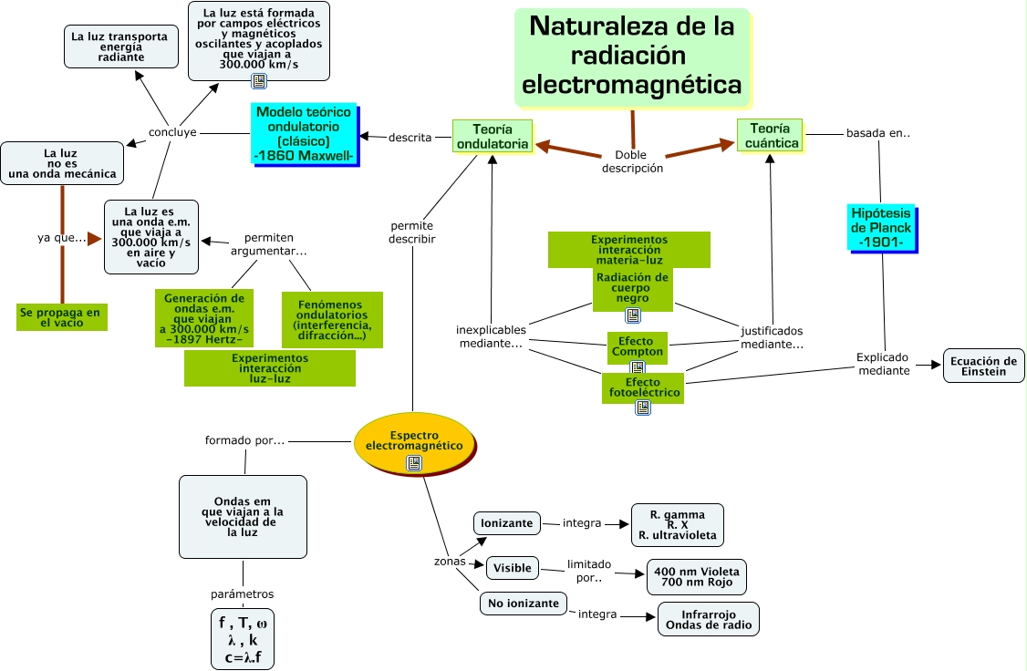 Este Cmap, tiene información relacionada con: Naturaleza rem, Modelo teórico ondulatorio (clásico) -1860 Maxwell- concluye La luz es una onda e.m. que viaja a 300.000 km/s en aire y vacío, Espectro electromagnético zonas Visible, Efecto fotoeléctrico inexplicables mediante... Teoría ondulatoria, Ionizante integra R. gamma R. X R. ultravioleta, Efecto fotoeléctrico justificados mediante... Teoría cuántica, Radiación de cuerpo negro inexplicables mediante... Teoría ondulatoria, Visible limitado por.. 400 nm Violeta 700 nm Rojo, Espectro electromagnético zonas Ionizante, Naturaleza de la radiación electromagnética Doble descripción Teoría cuántica, Radiación de cuerpo negro justificados mediante... Teoría cuántica, Efecto fotoeléctrico Explicado mediante Ecuación de Einstein, Efecto Compton justificados mediante... Teoría cuántica, Hipótesis de Planck -1901- Explicado mediante Ecuación de Einstein, La luz no es una onda mecánica ya que... La luz es una onda e.m. que viaja a 300.000 km/s en aire y vacío, La luz no es una onda mecánica ya que... Se propaga en el vacío, Espectro electromagnético zonas No ionizante, Teoría ondulatoria descrita Modelo teórico ondulatorio (clásico) -1860 Maxwell-, Generación de ondas e.m. que viajan a 300.000 km/s -1897 Hertz- permiten argumentar... La luz es una onda e.m. que viaja a 300.000 km/s en aire y vacío, Modelo teórico ondulatorio (clásico) -1860 Maxwell- concluye La luz transporta energía radiante, Modelo teórico ondulatorio (clásico) -1860 Maxwell- concluye La luz no es una onda mecánica