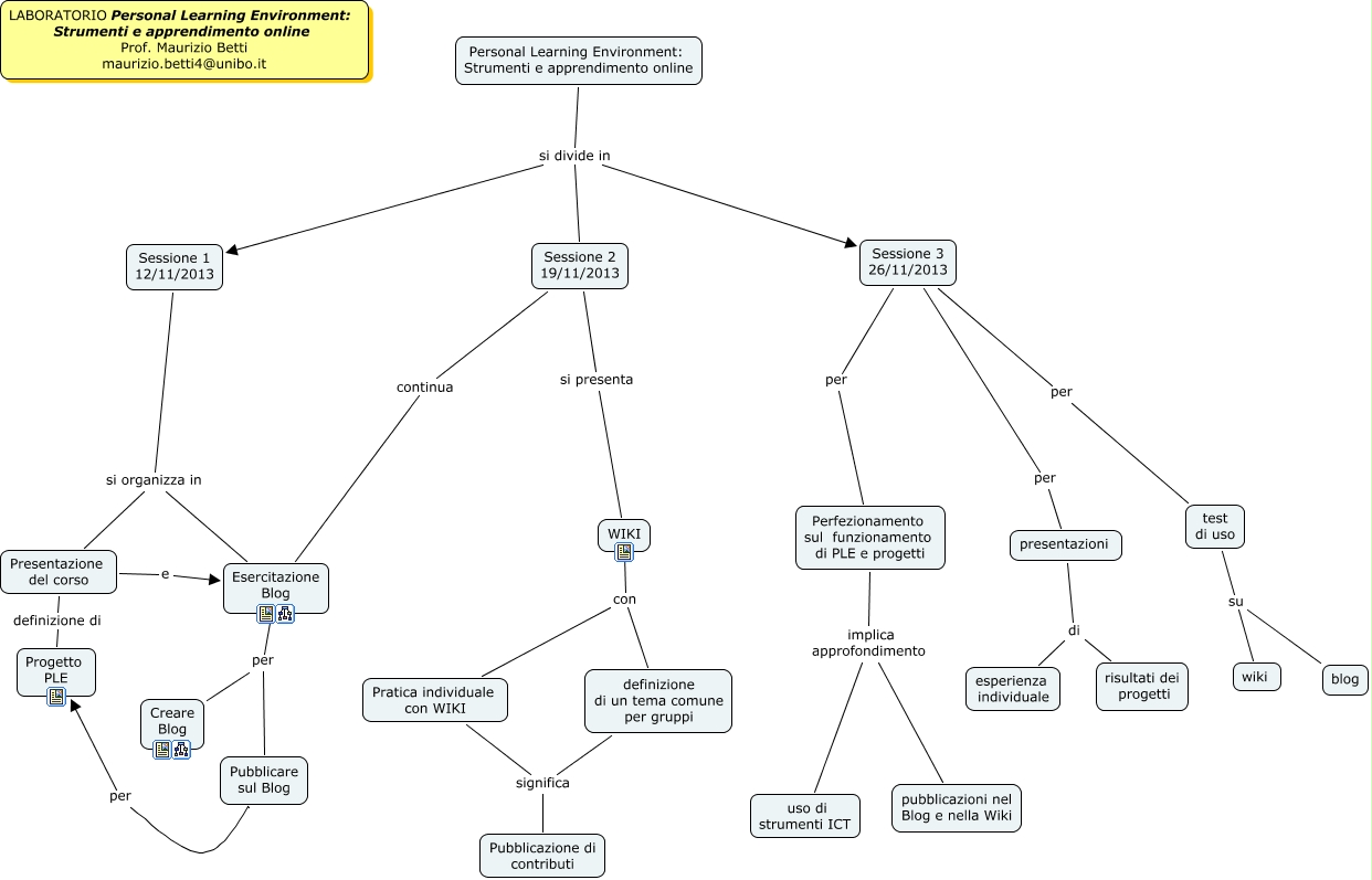 Questa Cmap, creata con IHMC CmapTools, contiene informazioni relative a: Struttura Laboratorio PLE_AA13-14_Rimini, Sessione 1 12/11/2013 si organizza in Presentazione del corso, Perfezionamento sul funzionamento di PLE e progetti implica approfondimento pubblicazioni nel Blog e nella Wiki, Sessione 3 26/11/2013 per test di uso, test di uso su blog, Presentazione del corso e Esercitazione Blog, Sessione 2 19/11/2013 continua Esercitazione Blog, Pratica individuale con WIKI significa Pubblicazione di contributi, Personal Learning Environment: Strumenti e apprendimento online si divide in Sessione 2 19/11/2013, Sessione 2 19/11/2013 si presenta WIKI, Pubblicare sul Blog per Progetto PLE, Presentazione del corso definizione di Progetto PLE, Sessione 3 26/11/2013 per presentazioni, Personal Learning Environment: Strumenti e apprendimento online si divide in Sessione 3 26/11/2013, presentazioni di risultati dei progetti, Esercitazione Blog per Creare Blog, Perfezionamento sul funzionamento di PLE e progetti implica approfondimento uso di strumenti ICT, Sessione 3 26/11/2013 per Perfezionamento sul funzionamento di PLE e progetti, Esercitazione Blog per Pubblicare sul Blog, Personal Learning Environment: Strumenti e apprendimento online si divide in Sessione 1 12/11/2013, test di uso su wiki