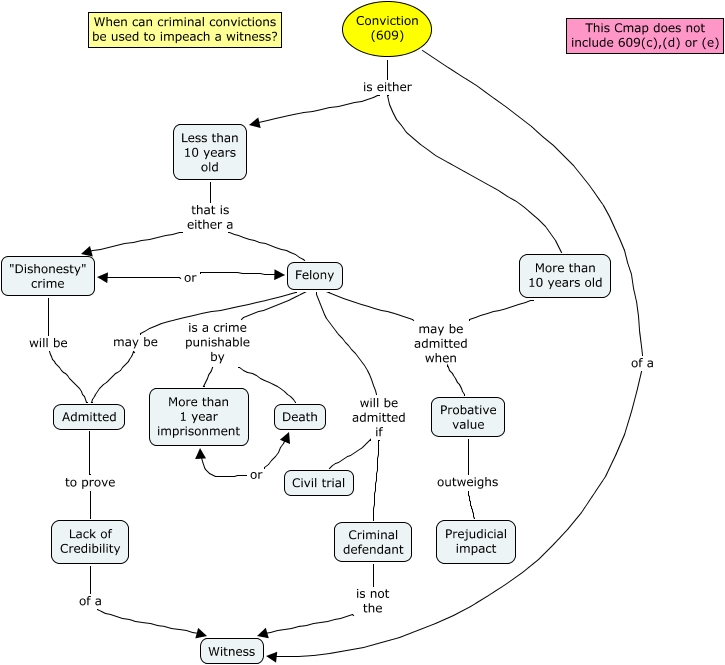 This Concept Map, created with IHMC CmapTools, has information related to: 609 Conviction, Felony is a crime punishable by More than 1 year imprisonment, Probative value outweighs Prejudicial impact, Criminal defendant is not the Witness, Less than 10 years old that is either a Felony, Admitted to prove Lack of Credibility, Felony is a crime punishable by Death, "Dishonesty" crime will be Admitted, Conviction (609) of a Witness, Felony may be Admitted, Felony may be admitted when Probative value, Conviction (609) is either Less than 10 years old, Felony will be admitted if Civil trial, Conviction (609) is either More than 10 years old, Less than 10 years old that is either a "Dishonesty" crime, Lack of Credibility of a Witness, Felony will be admitted if Criminal defendant, More than 10 years old may be admitted when Probative value