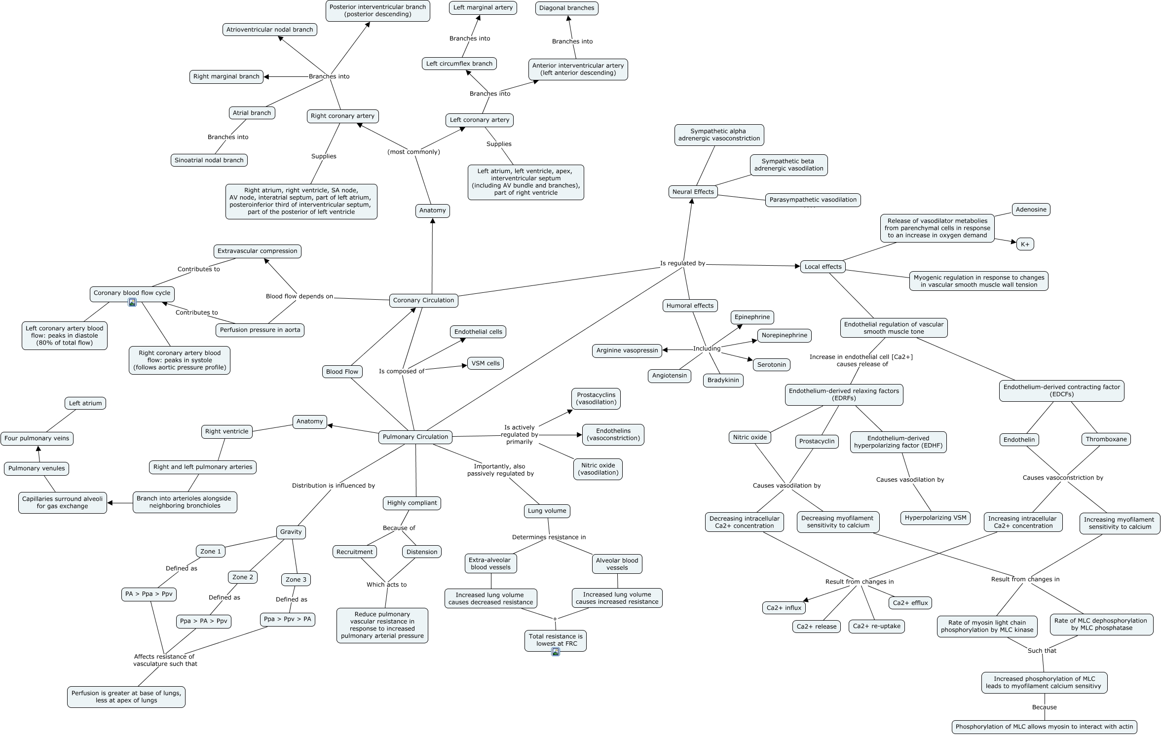 This Concept Map, created with IHMC CmapTools, has information related to: Coronary and Pulmonary Blood Flow, Increasing myofilament sensitivity to calcium Result from changes in Rate of MLC dephosphorylation by MLC phosphatase, Blood Flow ???? Coronary Circulation, Zone 2 Defined as Ppa > PA > Ppv, Right coronary artery Branches into Right marginal branch, Endothelium-derived contracting factor (EDCFs) ???? Thromboxane, Atrial branch Branches into Sinoatrial nodal branch, Coronary Circulation Is composed of VSM cells, Increased lung volume causes decreased resistance + Total resistance is lowest at FRC, Endothelin Causes vasoconstriction by Increasing myofilament sensitivity to calcium, Highly compliant Because of Recruitment, Nitric oxide Causes vasodilation by Decreasing myofilament sensitivity to calcium, Coronary Circulation Blood flow depends on Perfusion pressure in aorta, PA > Ppa > Ppv Affects resistance of vasculature such that Perfusion is greater at base of lungs, less at apex of lungs, Endothelium-derived contracting factor (EDCFs) ???? Endothelin, Coronary Circulation Is regulated by Local effects, Pulmonary Circulation Is actively regulated by primarily Endothelins (vasoconstriction), Humoral effects Including Norepinephrine, Increasing intracellular Ca2+ concentration Result from changes in Ca2+ release, Pulmonary Circulation Distribution is influenced by Gravity, Pulmonary Circulation Is regulated by Humoral effects