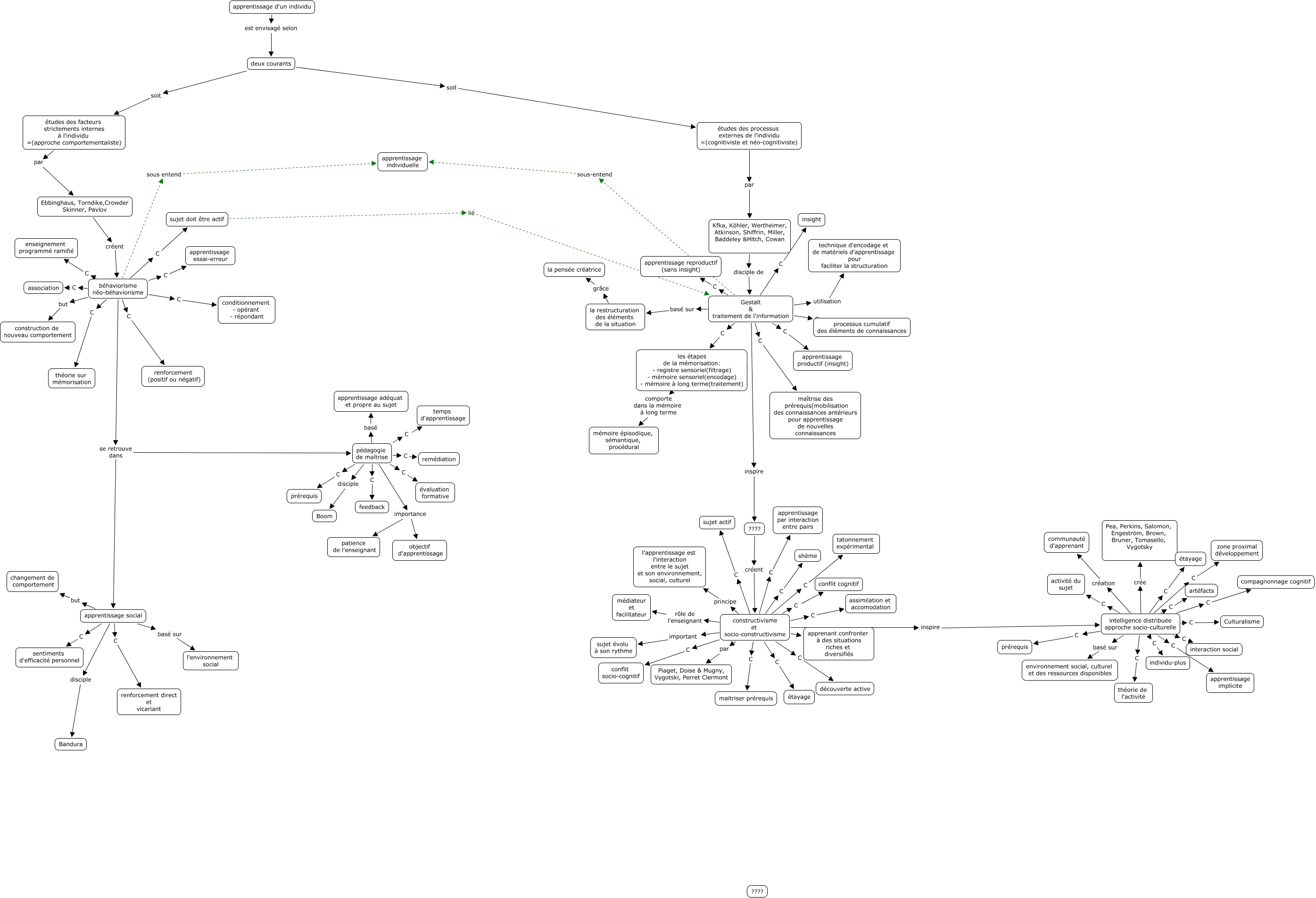 Cette carte de concepts créée avec IHMC CmapTools traite de: carte conceptuelle p3 A1, pédagogie de maîtrise basé apprentissage adéquat et propre au sujet, Gestalt & traitement de l'information C maîtrise des prérequis(mobilisation des connaissances antérieurs pour apprentissage de nouvelles connaissances, constructivisme et socio-constructivisme C tatonnement expérimental, intelligence distribuée approche socio-culturelle C compagnonnage cognitif, apprentissage social C sentiments d'efficacité personnel, intelligence distribuée approche socio-culturelle C activité du sujet, intelligence distribuée approche socio-culturelle C zone proximal développement, constructivisme et socio-constructivisme C étayage, pédagogie de maîtrise importance objectif d'apprentissage, constructivisme et socio-constructivisme C assimilation et accomodation, constructivisme et socio-constructivisme C conflit cognitif, constructivisme et socio-constructivisme rôle de l'enseignant médiateur et facilitateur, constructivisme et socio-constructivisme C maitriser prérequis, béhaviorisme néo-béhaviorisme C renforcement (positif ou négatif), pédagogie de maîtrise C feedback, constructivisme et socio-constructivisme C conflit socio-cognitif, Gestalt & traitement de l'information sous-entend apprentissage individuelle, intelligence distribuée approche socio-culturelle création communauté d'apprenant, intelligence distribuée approche socio-culturelle C étayage, constructivisme et socio-constructivisme C découverte active