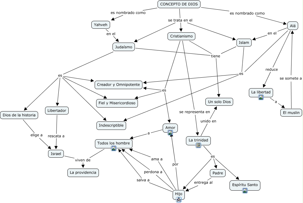 Este Cmap, tiene información relacionada con: Concepto de Dios, La trinidad es Padre, Alá es Creador y Omnipotente, Cristianismo tiene Un solo Dios, Hijo ama a Todos los hombre, Padre entrega al Hijo, Israel viven de La providencia, Judaísmo es Dios de la historia, Hijo por Amor, Judaísmo tiene Un solo Dios, Judaísmo es Fiel y Misericordioso, Cristianismo se representa en La trinidad, Yahveh en el Judaísmo, La trinidad es Espíritu Santo, Judaísmo es Indescriptible, Cristianismo es Amor, Islam es Indescriptible, La trinidad unido en Un solo Dios, Amor a Todos los hombre, Dios de la historia elige a Israel, Alá en el Islam
