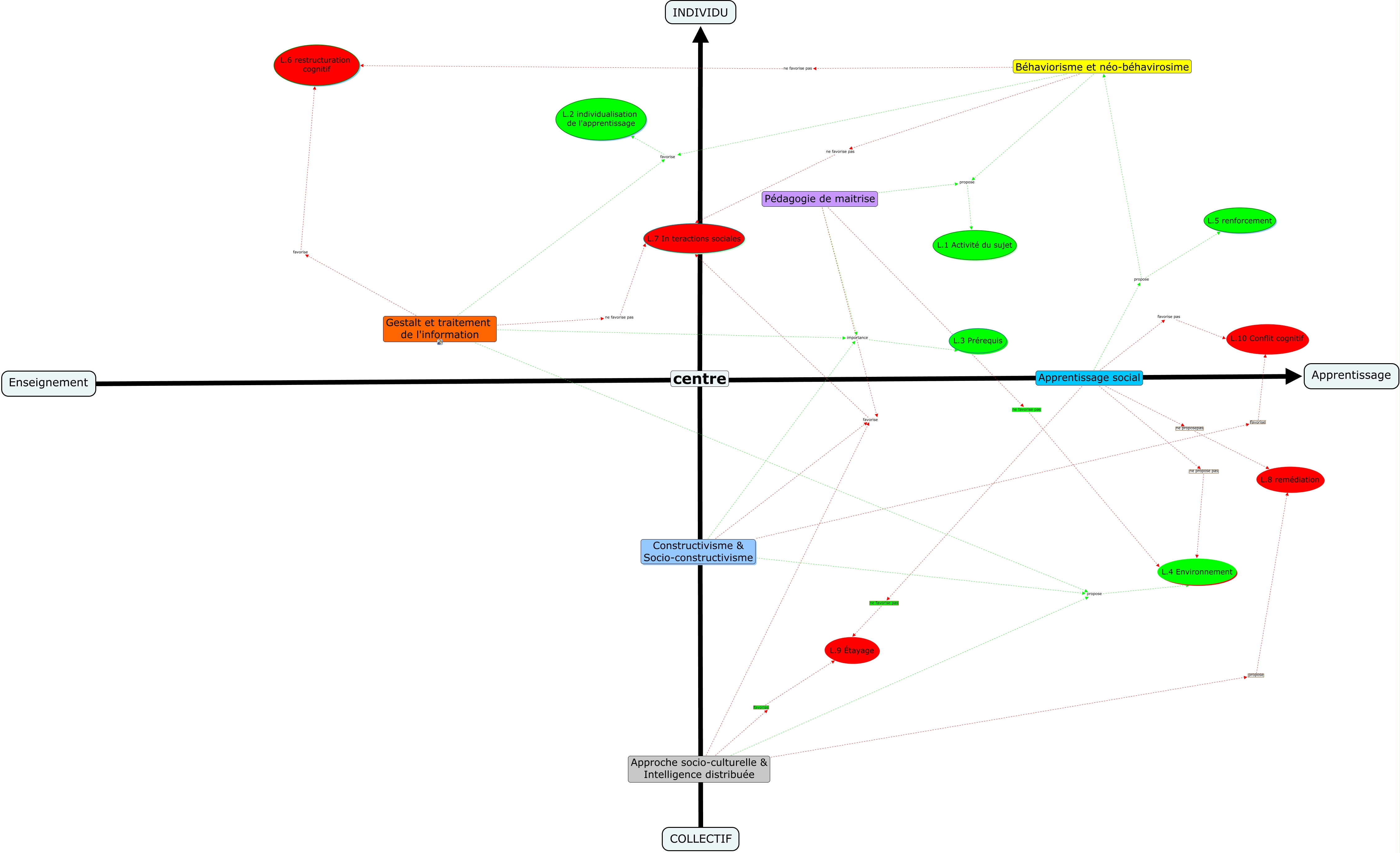 Cette carte de concepts créée avec IHMC CmapTools traite de: carte conceptuelle 6 familles, Pédagogie de maitrise ne favorise pas L.4 Environnement, Approche socio-culturelle & Intelligence distribuée favorise L.9 Étayage, Approche socio-culturelle & Intelligence distribuée propose L.8 remédiation, Pédagogie de maitrise favorise L.7 In teractions sociales, Constructivisme & Socio-constructivisme favorise L.7 In teractions sociales, Apprentissage social propose L.5 renforcement, Pédagogie de maitrise importance L.3 Prérequis, Gestalt et traitement de l'information propose L.4 Environnement, Approche socio-culturelle & Intelligence distribuée propose L.4 Environnement, Béhaviorisme et néo-béhavirosime propose L.1 Activité du sujet, Apprentissage social favorise pas L.10 Conflit cognitif, Constructivisme & Socio-constructivisme favorise L.10 Conflit cognitif, Approche socio-culturelle & Intelligence distribuée favorise L.9 Étayage, Apprentissage social ne proposepas L.8 remédiation, Apprentissage social ne propose pas L.4 Environnement, Approche socio-culturelle & Intelligence distribuée favorise L.7 In teractions sociales, Gestalt et traitement de l'information ne favorise pas L.7 In teractions sociales, Apprentissage social propose Béhaviorisme et néo-béhavirosime, Constructivisme & Socio-constructivisme importance L.3 Prérequis, Pédagogie de maitrise propose L.1 Activité du sujet