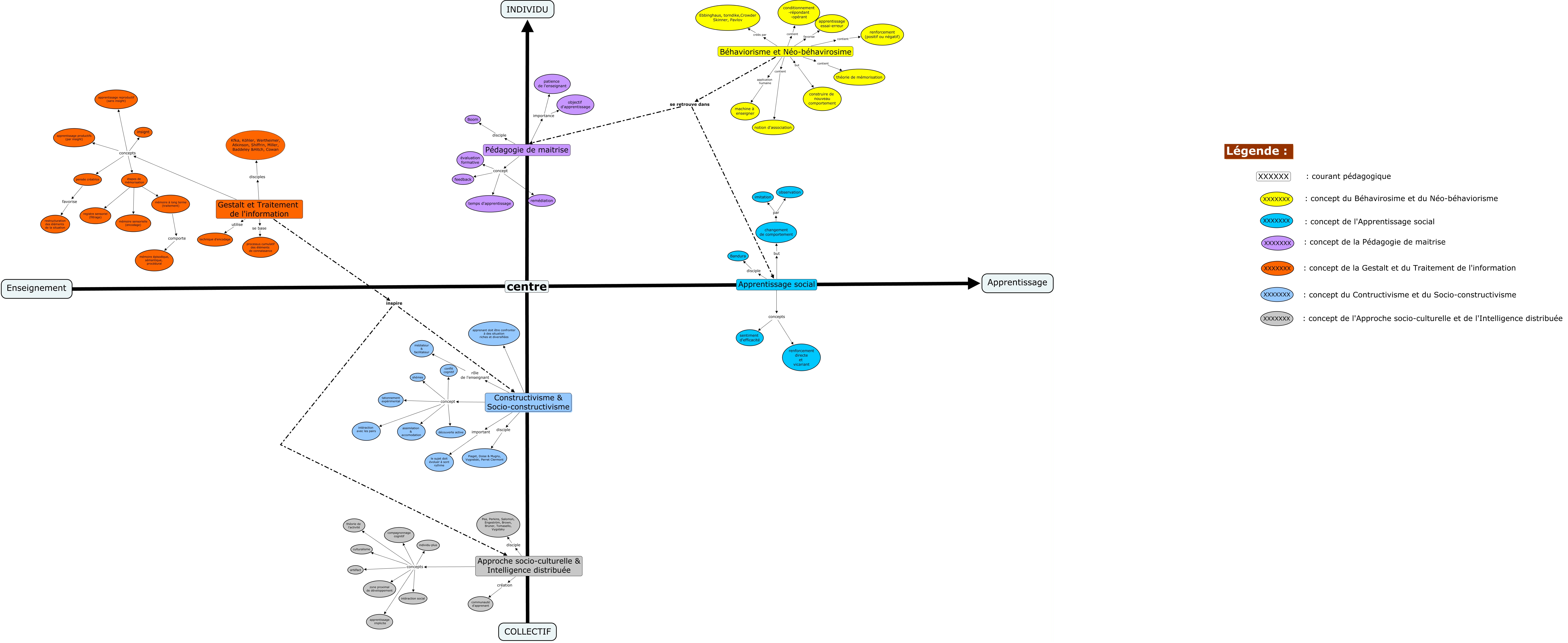 Cette carte de concepts créée avec IHMC CmapTools traite de: carte conceptuelle 6 familles 3 (sans similitudes et oppositions), Constructivisme & Socio-constructivisme concept shèmes, Apprentissage social disciple Bandura, Gestalt et Traitement de l'information inspire Approche socio-culturelle & Intelligence distribuée, Approche socio-culturelle & Intelligence distribuée concepts théorie de l'activité, Approche socio-culturelle & Intelligence distribuée concepts intéraction social, Béhaviorisme et Néo-béhavirosime but construire de nouveau comportement, Béhaviorisme et Néo-béhavirosime contient théorie de mémorisation, Constructivisme & Socio-constructivisme concept conflit cognitif, Approche socio-culturelle & Intelligence distribuée concepts individu-plus, concepts ???? sentiment d'efficacité, Gestalt et Traitement de l'information concepts apprentissage productifs (par insight), Pédagogie de maitrise concept temps d'apprentissage, Approche socio-culturelle & Intelligence distribuée disciple Pea, Perkins, Salomon, Engeström, Brown, Bruner, Tomasello, Vygotsky, Béhaviorisme et Néo-béhavirosime contient notion d'association, concepts ???? renforcement directe et vicariant, changement de comportement par observation, Constructivisme & Socio-constructivisme concept tatonnement expérimental, Approche socio-culturelle & Intelligence distribuée création communauté d'apprenant, Gestalt et Traitement de l'information disciples Kfka, Köhler, Wertheimer, Atkinson, Shiffrin, Miller, Baddeley &Hitch, Cowan, Pédagogie de maitrise importance patience de l'enseignant