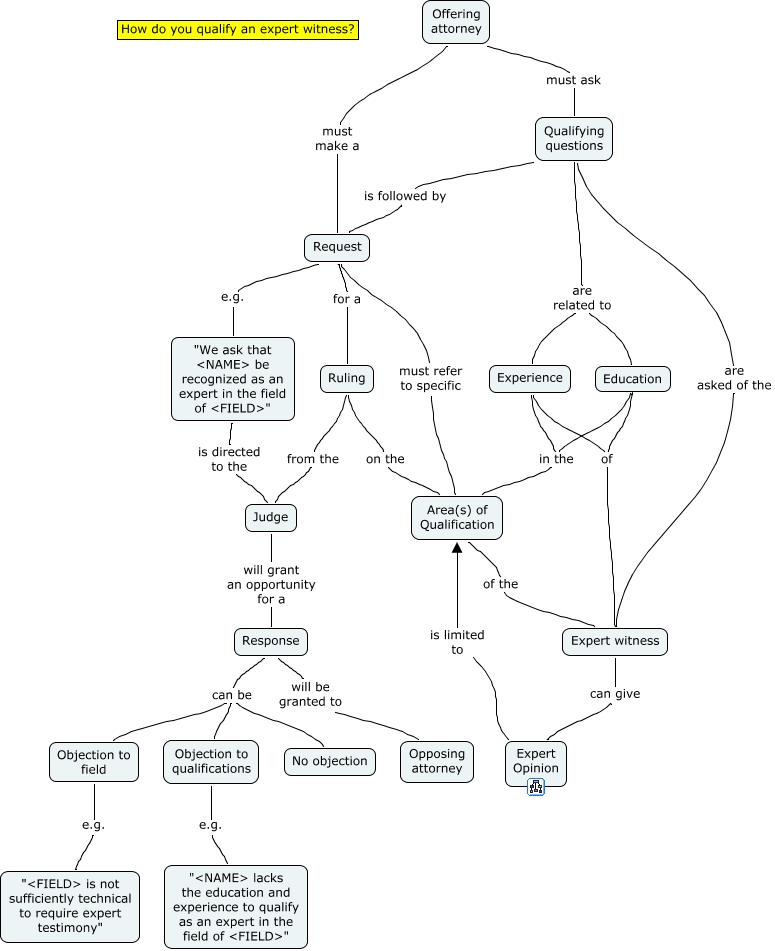 This Concept Map, created with IHMC CmapTools, has information related to: 402 Qualifying expert, Objection to field e.g. "<FIELD> is not sufficiently technical to require expert testimony", "We ask that <NAME> be recognized as an expert in the field of <FIELD>" is directed to the Judge, Qualifying questions are asked of the Expert witness, Ruling on the Area(s) of Qualification, Objection to qualifications e.g. "<NAME> lacks the education and experience to qualify as an expert in the field of <FIELD>", Education in the Area(s) of Qualification, Expert Opinion is limited to Area(s) of Qualification, Request e.g. "We ask that <NAME> be recognized as an expert in the field of <FIELD>", Judge will grant an opportunity for a Response, Offering attorney must make a Request, Response can be Objection to qualifications, Response can be Objection to field, Experience of Expert witness, Response can be No objection, Experience in the Area(s) of Qualification, Request must refer to specific Area(s) of Qualification, Ruling from the Judge, Offering attorney must ask Qualifying questions, Response will be granted to Opposing attorney, Area(s) of Qualification of the Expert witness