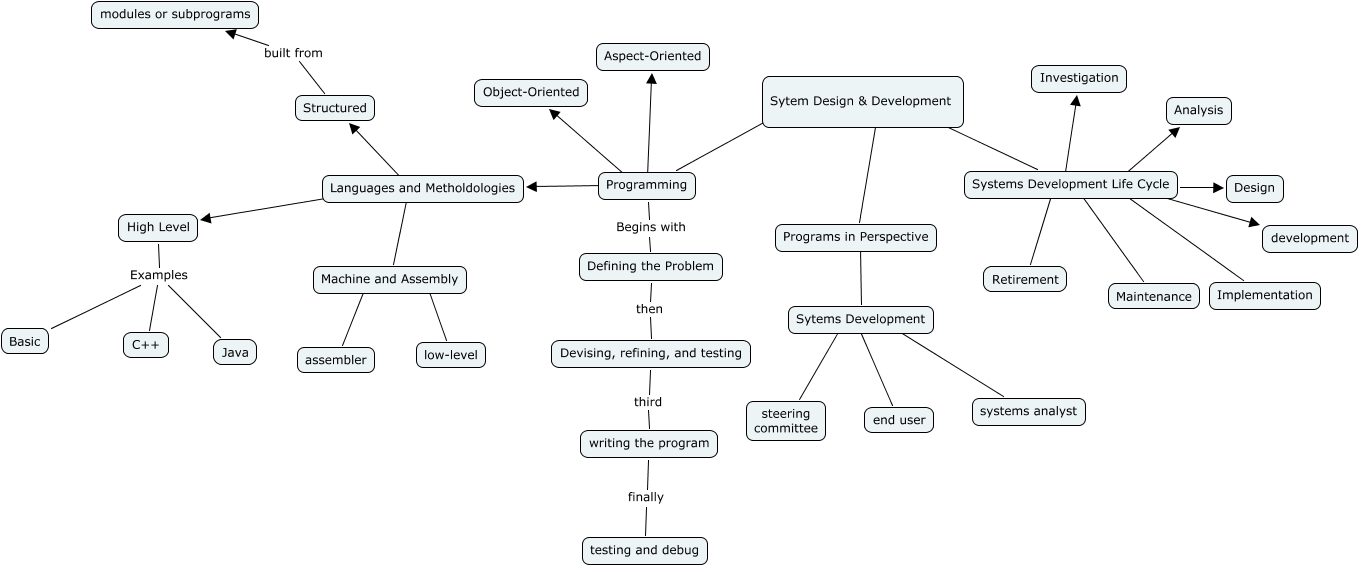 This Concept Map, created with IHMC CmapTools, has information related to: Reed Caruso, Systems Development Life Cycle ???? Design, Sytem Design & Development ???? Programming, Programming ???? Object-Oriented, Languages and Metholdologies ???? Structured, Systems Development Life Cycle ???? Retirement, writing the program finally testing and debug, Systems Development Life Cycle ???? Implementation, Sytem Design & Development ???? Programs in Perspective, Systems Development Life Cycle ???? Analysis, High Level Examples Java, Programming ???? Aspect-Oriented, Programming ???? Languages and Metholdologies, Programming Begins with Defining the Problem, Sytem Design & Development ???? Systems Development Life Cycle, Sytems Development ???? systems analyst, Devising, refining, and testing third writing the program, Machine and Assembly ???? assembler, Programs in Perspective ???? Sytems Development, High Level Examples C++, Languages and Metholdologies ???? Machine and Assembly
