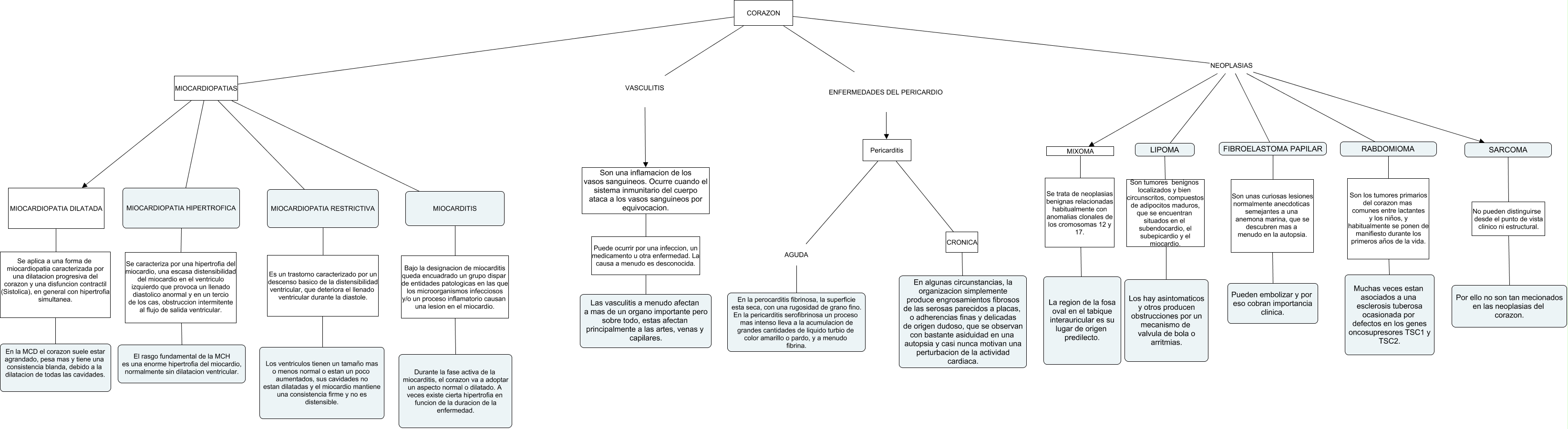 Este Cmap, tiene información relacionada con: FANIKA, CORAZON NEOPLASIAS SARCOMA, MIOCARDIOPATIA RESTRICTIVA Es un trastorno caracterizado por un descenso basico de la distensibilidad ventricular, que deteriora el llenado ventricular durante la diastole. Los ventriculos tienen un tamaño mas o menos normal o estan un poco aumentados, sus cavidades no estan dilatadas y el miocardio mantiene una consistencia firme y no es distensible., CORAZON MIOCARDIOPATIAS MIOCARDIOPATIA DILATADA, CORAZON NEOPLASIAS RABDOMIOMA, MIOCARDIOPATIA DILATADA Se aplica a una forma de miocardiopatia caracterizada por una dilatacion progresiva del corazon y una disfuncion contractil (Sistolica), en general con hipertrofia simultanea. En la MCD el corazon suele estar agrandado, pesa mas y tiene una consistencia blanda, debido a la dilatacion de todas las cavidades., CORAZON NEOPLASIAS FIBROELASTOMA PAPILAR, CORAZON NEOPLASIAS LIPOMA, MIOCARDITIS Bajo la designacion de miocarditis queda encuadrado un grupo dispar de entidades patologicas en las que los microorganismos infecciosos y/o un proceso inflamatorio causan una lesion en el miocardio. Durante la fase activa de la miocarditis, el corazon va a adoptar un aspecto normal o dilatado. A veces existe cierta hipertrofia en funcion de la duracion de la enfermedad., CORAZON VASCULITIS Son una inflamacion de los vasos sanguineos. Ocurre cuando el sistema inmunitario del cuerpo ataca a los vasos sanguineos por equivocacion., Pericarditis CRONICA En algunas circunstancias, la organizacion simplemente produce engrosamientos fibrosos de las serosas parecidos a placas, o adherencias finas y delicadas de origen dudoso, que se observan con bastante asiduidad en una autopsia y casi nunca motivan una perturbacion de la actividad cardiaca., CORAZON MIOCARDIOPATIAS MIOCARDIOPATIA HIPERTROFICA, CORAZON NEOPLASIAS MIXOMA, SARCOMA No pueden distinguirse desde el punto de vista clinico ni estructural. Por ello no son tan mecionados en las neoplasias del corazon., CORAZON MIOCARDIOPATIAS MIOCARDIOPATIA RESTRICTIVA, Pericarditis AGUDA En la perocarditis fibrinosa, la superficie esta seca, con una rugosidad de grano fino. En la pericarditis serofibrinosa un proceso mas intenso lleva a la acumulacion de grandes cantidades de liquido turbio de color amarillo o pardo, y a menudo fibrina., FIBROELASTOMA PAPILAR Son unas curiosas lesiones normalmente anecdoticas semejantes a una anemona marina, que se descubren mas a menudo en la autopsia. Pueden embolizar y por eso cobran importancia clinica., MIXOMA Se trata de neoplasias benignas relacionadas habitualmente con anomalias clonales de los cromosomas 12 y 17. La region de la fosa oval en el tabique interauricular es su lugar de origen predilecto., CORAZON MIOCARDIOPATIAS MIOCARDITIS, Son una inflamacion de los vasos sanguineos. Ocurre cuando el sistema inmunitario del cuerpo ataca a los vasos sanguineos por equivocacion. Puede ocurrir por una infeccion, un medicamento u otra enfermedad. La causa a menudo es desconocida. Las vasculitis a menudo afectan a mas de un organo importante pero sobre todo, estas afectan principalmente a las artes, venas y capilares., MIOCARDIOPATIA HIPERTROFICA Se caracteriza por una hipertrofia del miocardio, una escasa distensibilidad del miocardio en el ventriculo izquierdo que provoca un llenado diastolico anormal y en un tercio de los cas, obstruccion intermitente al flujo de salida ventricular. El rasgo fundamental de la MCH es una enorme hipertrofia del miocardio, normalmente sin dilatacion ventricular.