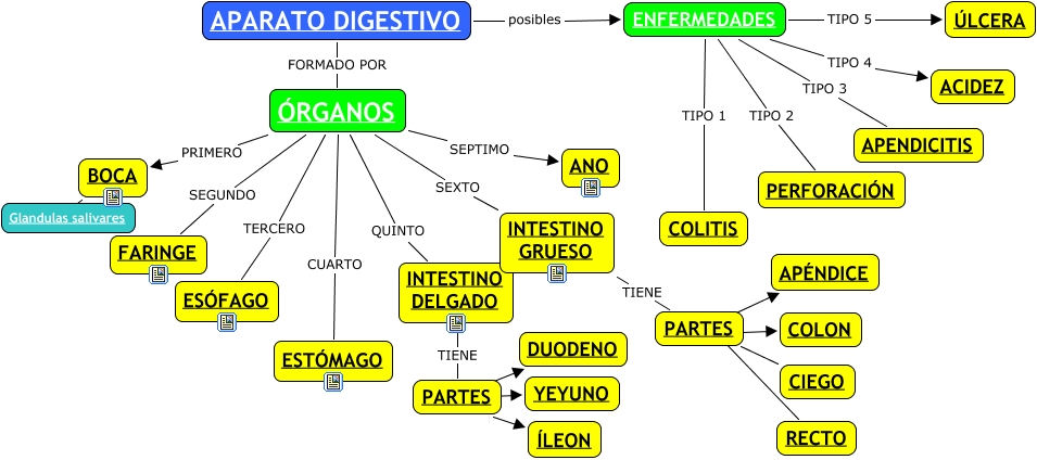 Este Cmap, tiene información relacionada con: Partes del aparato digestivo, BOCA Glandulas salivares, ÓRGANOS PRIMERO BOCA, ENFERMEDADES TIPO 2 PERFORACIÓN, APARATO DIGESTIVO posibles ENFERMEDADES, ÓRGANOS SEXTO INTESTINO GRUESO, ENFERMEDADES TIPO 4 ACIDEZ, ÓRGANOS SEGUNDO FARINGE, PARTES ???? COLON, APARATO DIGESTIVO FORMADO POR ÓRGANOS, ENFERMEDADES TIPO 1 COLITIS, PARTES ???? DUODENO, INTESTINO DELGADO TIENE PARTES, ÓRGANOS QUINTO INTESTINO DELGADO, PARTES ???? YEYUNO, ÓRGANOS SEPTIMO ANO, PARTES ???? APÉNDICE, ÓRGANOS CUARTO ESTÓMAGO, PARTES ???? CIEGO, PARTES ÍLEON, ENFERMEDADES TIPO 3 APENDICITIS