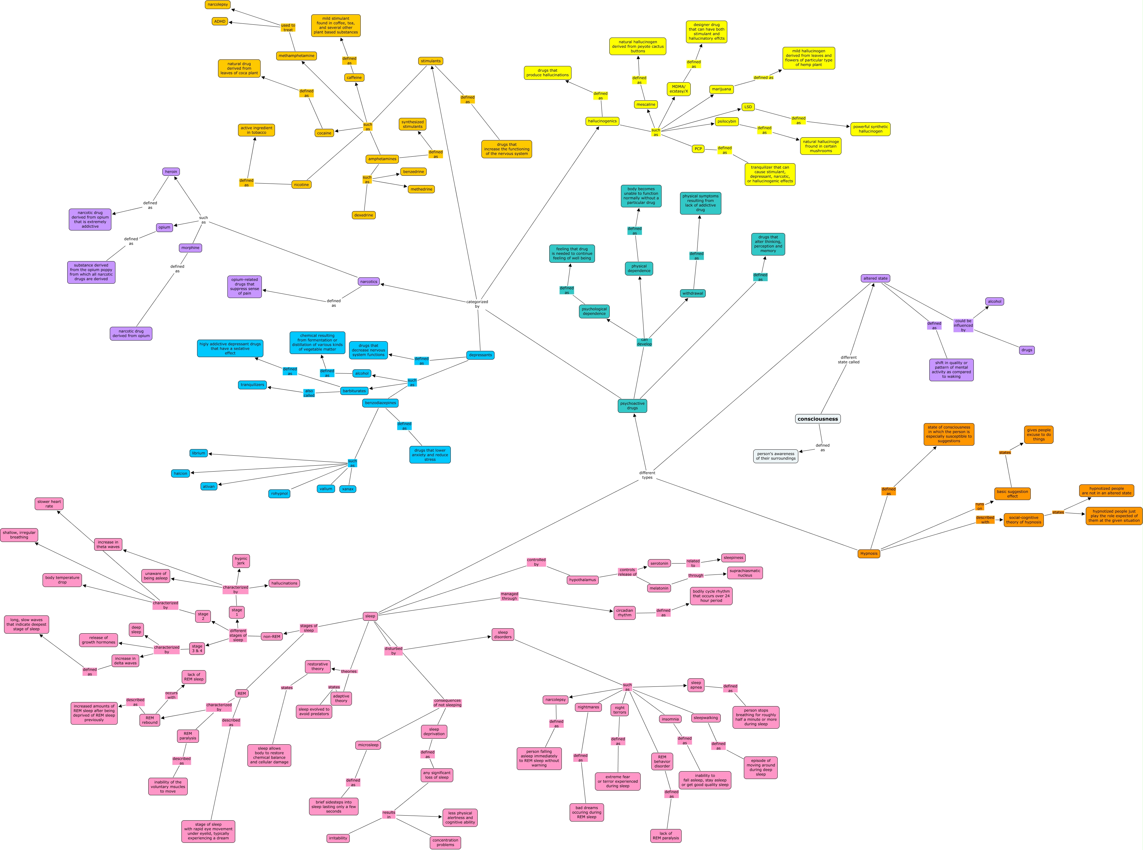This Concept Map, created with IHMC CmapTools, has information related to: Gerzina Chapter 4, stage 3 & 4 characterized by increase in delta waves, hypothalamus controls release of melatonin, stage 1 characterized by hallucinations, heroin defined as narcotic drug derived from opium that is extremely addictive, physical dependence defined as body becomes unable to function normally without a particular drug, altered state different types sleep, benzodiazepines such as valium, stimulants such as caffeine, altered state could be influenced by drugs, any significant loss of sleep results in irritability, barbiturates defined as higly addictive depressant drugs that have a sedative effect, sleep disorders such as narcolepsy, narcotics defined as opium-related drugs that suppress sense of pain, psychoactive drugs defined as drugs that alter thinking, perception and memory, nicotine defined as active ingredient in tobacco, narcotics such as opium, REM paralysis described as inability of the voluntary msucles to move, altered state defined as shift in quality or pattern of mental activity as compared to waking, stimulants such as methamphetamine, restorative theory states sleep allows body to restore chemical balance and cellular damage