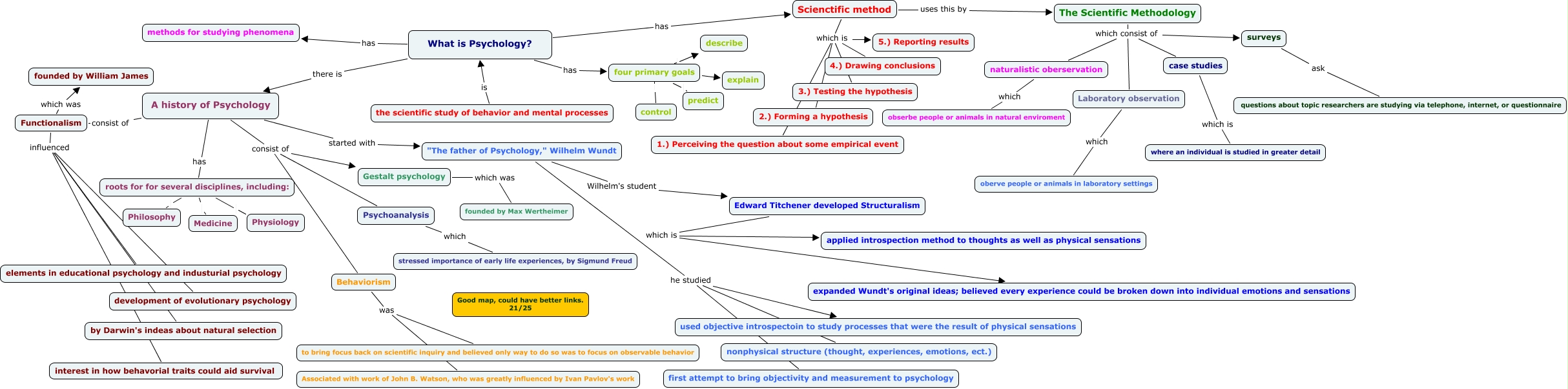 This Concept Map, created with IHMC CmapTools, has information related to: Ch. 1 LeeAnn Weiss 21, "The father of Psychology," Wilhelm Wundt Wilhelm's student Edward Titchener developed Structuralism, roots for for several disciplines, including: Physiology, Laboratory observation which oberve people or animals in laboratory settings, Functionalism influenced elements in educational psychology and industurial psychology, surveys ask questions about topic researchers are studying via telephone, internet, or questionnaire, Scienctific method which is 3.) Testing the hypothesis, Behaviorism was Associated with work of John B. Watson, who was greatly influenced by Ivan Pavlov's work, A history of Psychology has roots for for several disciplines, including:, What is Psychology? there is A history of Psychology, The Scientific Methodology which consist of Laboratory observation, The Scientific Methodology which consist of case studies, "The father of Psychology," Wilhelm Wundt he studied used objective introspectoin to study processes that were the result of physical sensations, Functionalism influenced by Darwin's indeas about natural selection, the scientific study of behavior and mental processes is What is Psychology?, roots for for several disciplines, including: Philosophy, four primary goals control, Scienctific method which is 2.) Forming a hypothesis, four primary goals ???? explain, What is Psychology? has four primary goals, A history of Psychology consist of Behaviorism