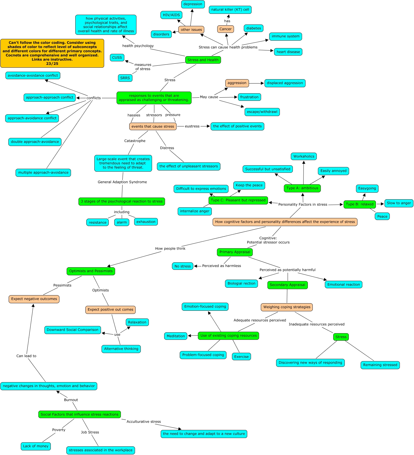 This Concept Map, created with IHMC CmapTools, has information related to: Lemon Ch 11- Stress and Health 23, Secondary Appraisal ???? Weighing coping strategies, 3 stages of the psychological reaction to stress including alarm, Stress and Health Stress can cause health problems other issues, Use of existing coping resources ???? Exercise, Type C: Pleasant but repressed ???? Keep the peace, Stress ???? Discovering new ways of responding, Stress and Health Stress responses to events that are appraised as challenging or threatening., Cancer has natural killer (KT) cell, other issues ???? disorders, responses to events that are appraised as challenging or threatening. hassles events that cause stress, responses to events that are appraised as challenging or threatening. stressors events that cause stress, How cognitive factors and personality differences affect the experience of stress How people think Optimists and Pessimists, How cognitive factors and personality differences affect the experience of stress Personality Factors in stress Type B: relaxed, Type A: ambitious ???? Successful but unsatisfied, Social Factors that influence stress reactions Poverty Lack of money, other issues ???? depression, Use of existing coping resources ???? Problem-focused coping, Stress and Health measures of stress SRRS, Stress and Health Stress can cause health problems heart disease, Large-scale event that creates tremendous need to adapt to the feeling of threat. General Adaption Syndrome 3 stages of the psychological reaction to stress
