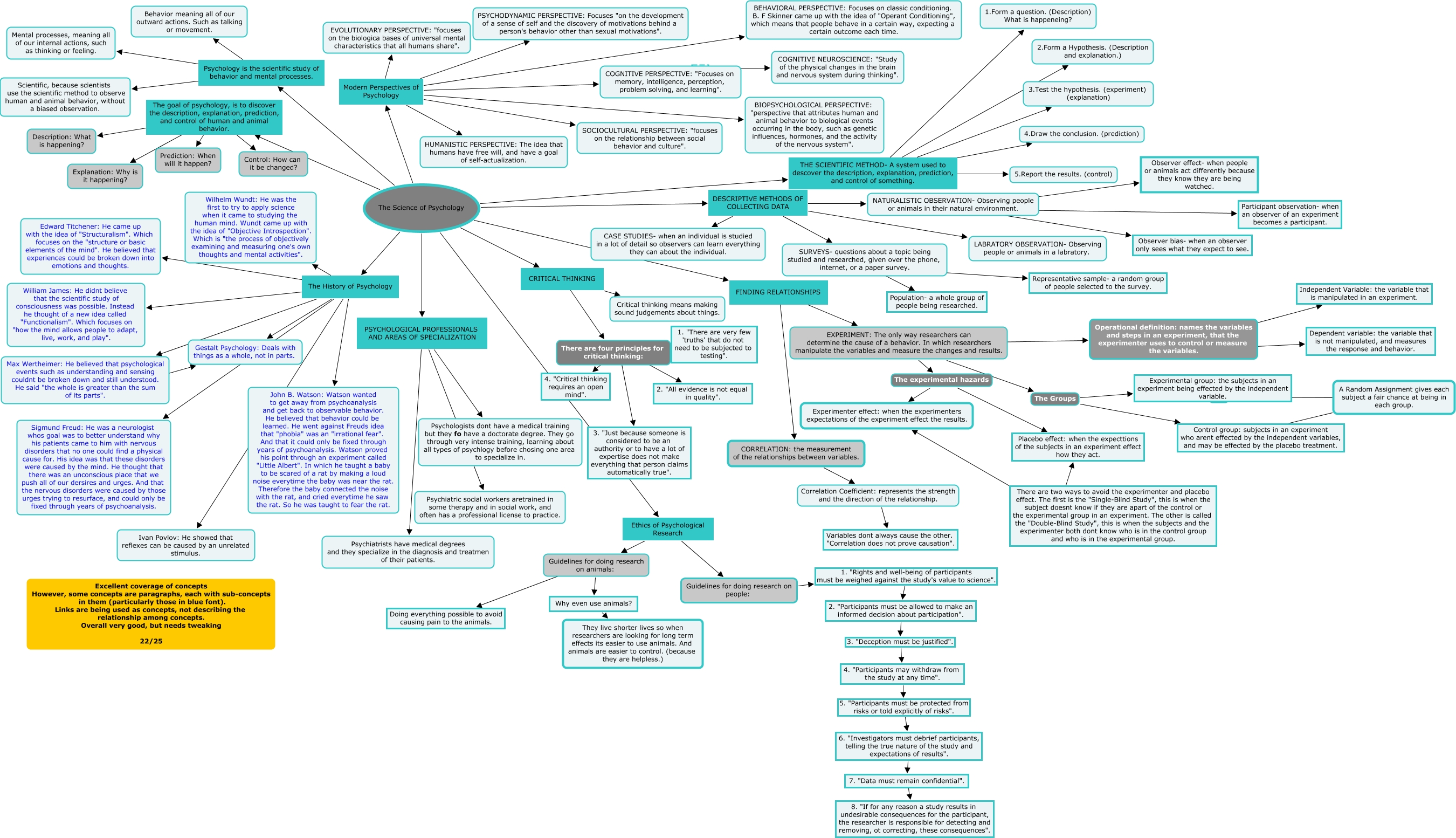This Concept Map, created with IHMC CmapTools, has information related to: virginia resmondo ch1 22, The Science of Psychology The goal of psychology, is to discover the description, explanation, prediction, and control of human and animal behavior. Prediction: When will it happen?, A Random Assignment gives each subject a fair chance at being in each group. ???? Control group: subjects in an experiment who arent effected by the independent variables, and may be effected by the placebo treatment., The Science of Psychology The History of Psychology John B. Watson: Watson wanted to get away from psychoanalysis and get back to observable behavior. He believed that behavior could be learned. He went against Freuds idea that "phobia" was an "irrational fear". And that it could only be fixed through years of psychoanalysis. Watson proved his point through an experiment called "Little Albert". In which he taught a baby to be scared of a rat by making a loud noise everytime the baby was near the rat. Therefore the baby connected the noise with the rat, and cried everytime he saw the rat. So he was taught to fear the rat., NATURALISTIC OBSERVATION- Observing people or animals in their natural environment. ???? Observer bias- when an observer only sees what they expect to see., NATURALISTIC OBSERVATION- Observing people or animals in their natural environment. ???? Participant observation- when an observer of an experiment becomes a participant., Operational definition: names the variables and steps in an experiment, that the experimenter uses to control or measure the variables. ???? Independent Variable: the variable that is manipulated in an experiment., The Science of Psychology FINDING RELATIONSHIPS EXPERIMENT: The only way researchers can determine the cause of a behavior. In which researchers manipulate the variables and measure the changes and results., The Science of Psychology Psychology is the scientific study of behavior and mental processes. Mental processes, meaning all of our internal actions, such as thinking or feeling., The Science of Psychology THE SCIENTIFIC METHOD- A system used to descover the description, explanation, prediction, and control of something. 2.Form a Hypothesis. (Description and explanation.), A Random Assignment gives each subject a fair chance at being in each group. ???? Experimental group: the subjects in an experiment being effected by the independent variable., There are four principles for critical thinking: ???? 3. "Just because someone is considered to be an authority or to have a lot of expertise does not make everything that person claims automatically true"., Guidelines for doing research on people: 1. "Rights and well-being of participants must be weighed against the study's value to science". 2. "Participants must be allowed to make an informed decision about participation"., The Science of Psychology The goal of psychology, is to discover the description, explanation, prediction, and control of human and animal behavior. Description: What is happening?, Max Wertheimer: He believed that psychological events such as understanding and sensing couldnt be broken down and still understood. He said "the whole is greater than the sum of its parts". ???? Gestalt Psychology: Deals with things as a whole, not in parts., The Science of Psychology Ethics of Psychological Research Guidelines for doing research on people:, SURVEYS- questions about a topic being studied and researched, given over the phone, internet, or a paper survey. ???? Representative sample- a random group of people selected to the survey., CORRELATION: the measurement of the relationships between variables. Correlation Coefficient: represents the strength and the direction of the relationship. Variables dont always cause the other. "Correlation does not prove causation"., The Science of Psychology The History of Psychology Wilhelm Wundt: He was the first to try to apply science when it came to studying the human mind. Wundt came up with the idea of "Objective Introspection". Which is "the process of objectively examining and measuring one's own thoughts and mental activities"., The Science of Psychology THE SCIENTIFIC METHOD- A system used to descover the description, explanation, prediction, and control of something. 4.Draw the conclusion. (prediction), The Science of Psychology The History of Psychology Sigmund Freud: He was a neurologist whos goal was to better understand why his patients came to him with nervous disorders that no one could find a physical cause for. His idea was that these disorders were caused by the mind. He thought that there was an unconscious place that we push all of our dersires and urges. And that the nervous disorders were caused by those urges trying to resurface, and could only be fixed through years of psychoanalysis.