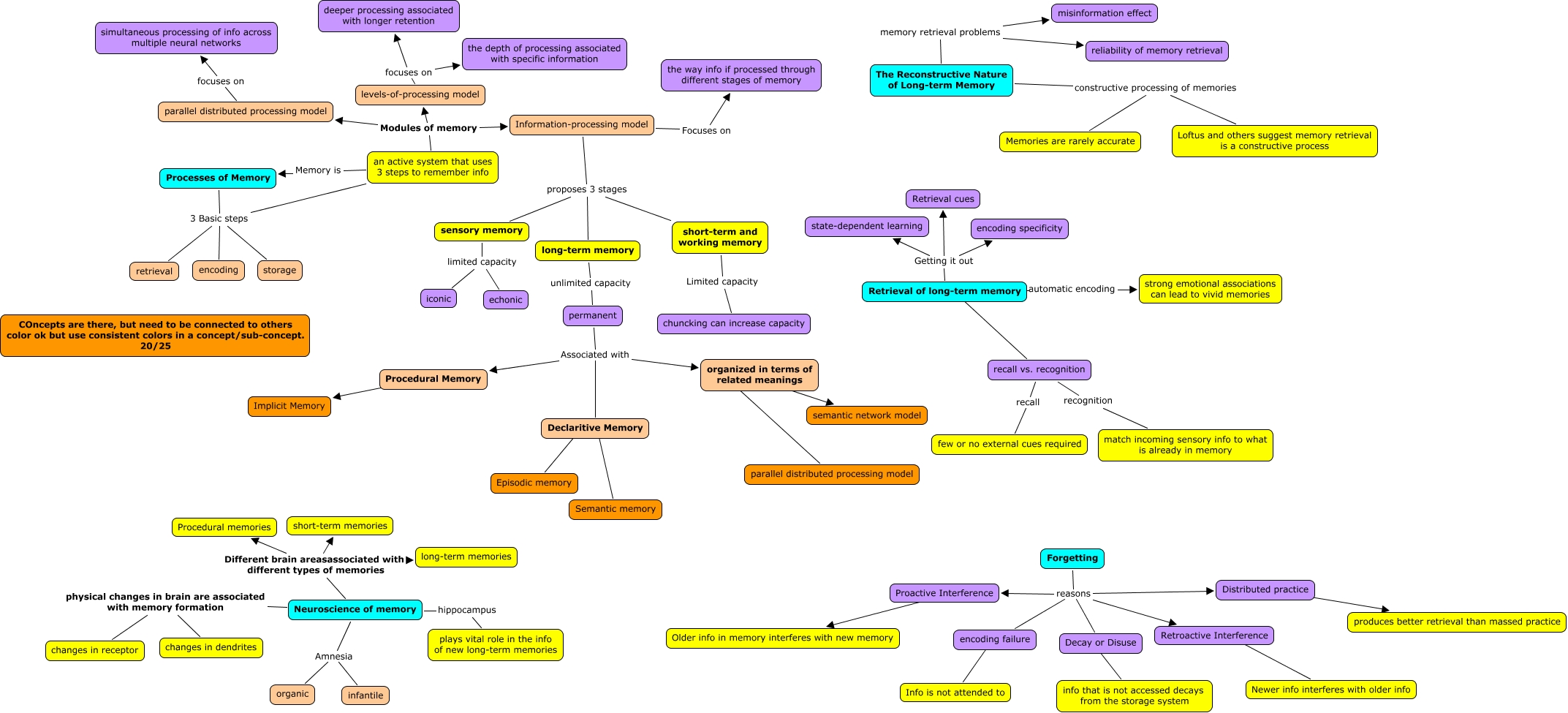 This Concept Map, created with IHMC CmapTools, has information related to: Lemon Ch 4- Memory 20, Retrieval of long-term memory automatic encoding strong emotional associations can lead to vivid memories, recall vs. recognition recognition match incoming sensory info to what is already in memory, The Reconstructive Nature of Long-term Memory memory retrieval problems misinformation effect, The Reconstructive Nature of Long-term Memory memory retrieval problems reliability of memory retrieval, Retroactive Interference ???? Newer info interferes with older info, an active system that uses 3 steps to remember info Memory is Processes of Memory, Neuroscience of memory Different brain areasassociated with different types of memories short-term memories, Neuroscience of memory Different brain areasassociated with different types of memories long-term memories, organized in terms of related meanings ???? parallel distributed processing model, Declaritive Memory ???? Semantic memory, levels-of-processing model focuses on deeper processing associated with longer retention, Decay or Disuse ???? info that is not accessed decays from the storage system, Retrieval of long-term memory Getting it out Retrieval cues, an active system that uses 3 steps to remember info 3 Basic steps encoding, Neuroscience of memory physical changes in brain are associated with memory formation changes in dendrites, Information-processing model proposes 3 stages short-term and working memory, The Reconstructive Nature of Long-term Memory constructive processing of memories Memories are rarely accurate, Distributed practice ???? produces better retrieval than massed practice, recall vs. recognition recall few or no external cues required, Forgetting reasons encoding failure