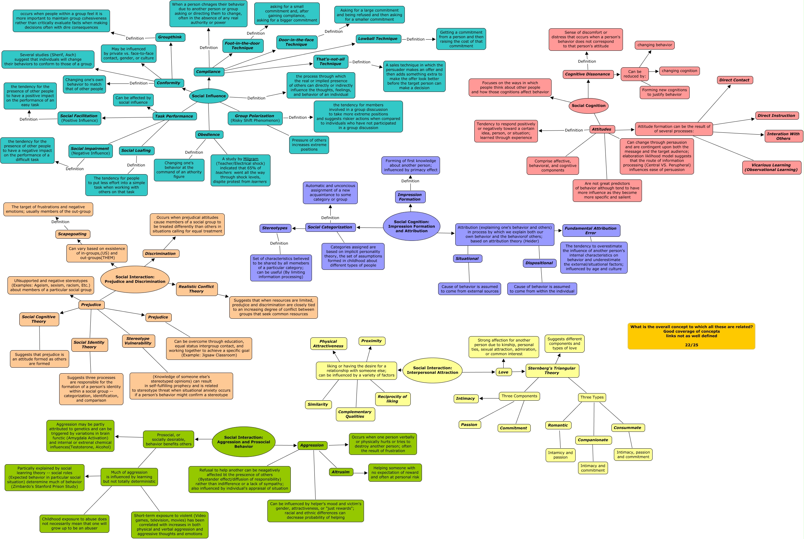 This Concept Map, created with IHMC CmapTools, has information related to: Draper- Ch 12 22, Sternberg's Triangular Theory ???? Three Types, Cognitive Dissonance Definition Sense of discomfort or distress that occurs when a person's behavior does not correspond to that person's attitude, liking or having the desire for a relationship with someone else; can be influenced by a variety of factors ???? Physical Attractiveness, Social Influence ???? Obedience, Task Performance ???? Can be affected by social influence, Dispositional ???? Cause of behavior is assumed to come from within the individual, Much of aggression is influenced by learning but not totally deterministic ???? Partically explained by social leanring theory -- social roles (Expected behavior in particular social situation) deteremine much of behavior (Zimbardo's Stanford Prison Study), Sternberg's Triangular Theory ???? Three Components, Attribution (explaining one's behavior and others) in process by which we explain both our own behavior and the behaviorof others; based on attribution theory (Heider) ???? Situational, Social Interaction: Prejudice and Discrimination ???? Can vary based on exsistence of in-groups,(US) and out-groups(THEM), Social impairment (Negative Influence) Definition the tendency for the presence of other people to have a negative impact on the performance of a difficult task, Group Polarization (Risky Shift Phenomenon) ???? Pressure of others increases extreme positions, Social Interaction: Aggression and Prosocial Behavior ???? Prosocial, or socially desirable, behavior benefits others, Cognitive Dissonance ???? Can be reduced by:, Three Types ???? Romantic, Conformity ???? Groupthink, Sternberg's Triangular Theory ???? Suggests different components and types of love, Aggression ???? Can be influenced by helper's mood and victim's gender, attractiveness, or "just rewards"; racial and ethnic differences can decrease probability of helping, liking or having the desire for a relationship with someone else; can be influenced by a variety of factors ???? Reciprocity of liking, Prejudice ???? Prejudice