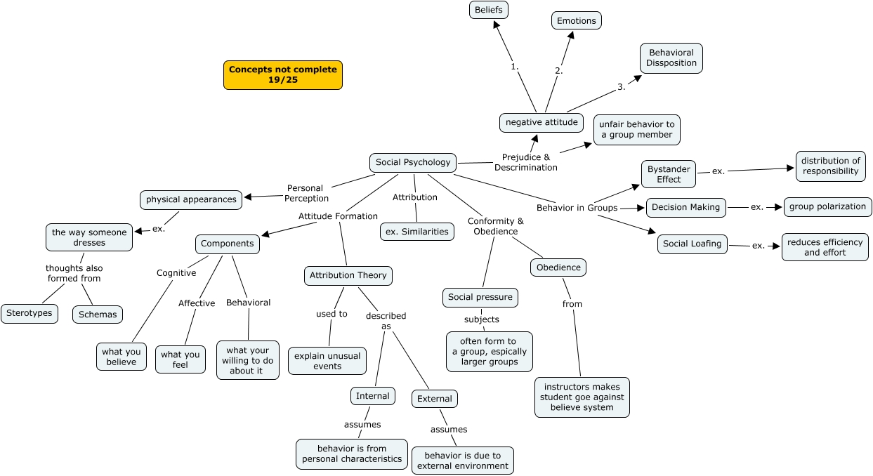 This Concept Map, created with IHMC CmapTools, has information related to: Fiol-Ch 12 19, Social pressure subjects often form to a group, espically larger groups, Components Behavioral what your willing to do about it, Obedience from instructors makes student goe against believe system, Bystander Effect ex. distribution of responsibility, Social Psychology Attribution ex. Similarities, negative attitude 2. Emotions, Social Psychology Conformity & Obedience Social pressure, the way someone dresses thoughts also formed from Sterotypes, Attribution Theory used to explain unusual events, Social Psychology Attitude Formation Attribution Theory, Social Psychology Prejudice & Descrimination unfair behavior to a group member, Components Cognitive what you believe, negative attitude 3. Behavioral Dissposition, Social Psychology Behavior in Groups Decision Making, Social Psychology Personal Perception physical appearances, Internal assumes behavior is from personal characteristics, the way someone dresses thoughts also formed from Schemas, Attribution Theory described as Internal, negative attitude 1. Beliefs, Social Loafing ex. reduces efficiency and effort