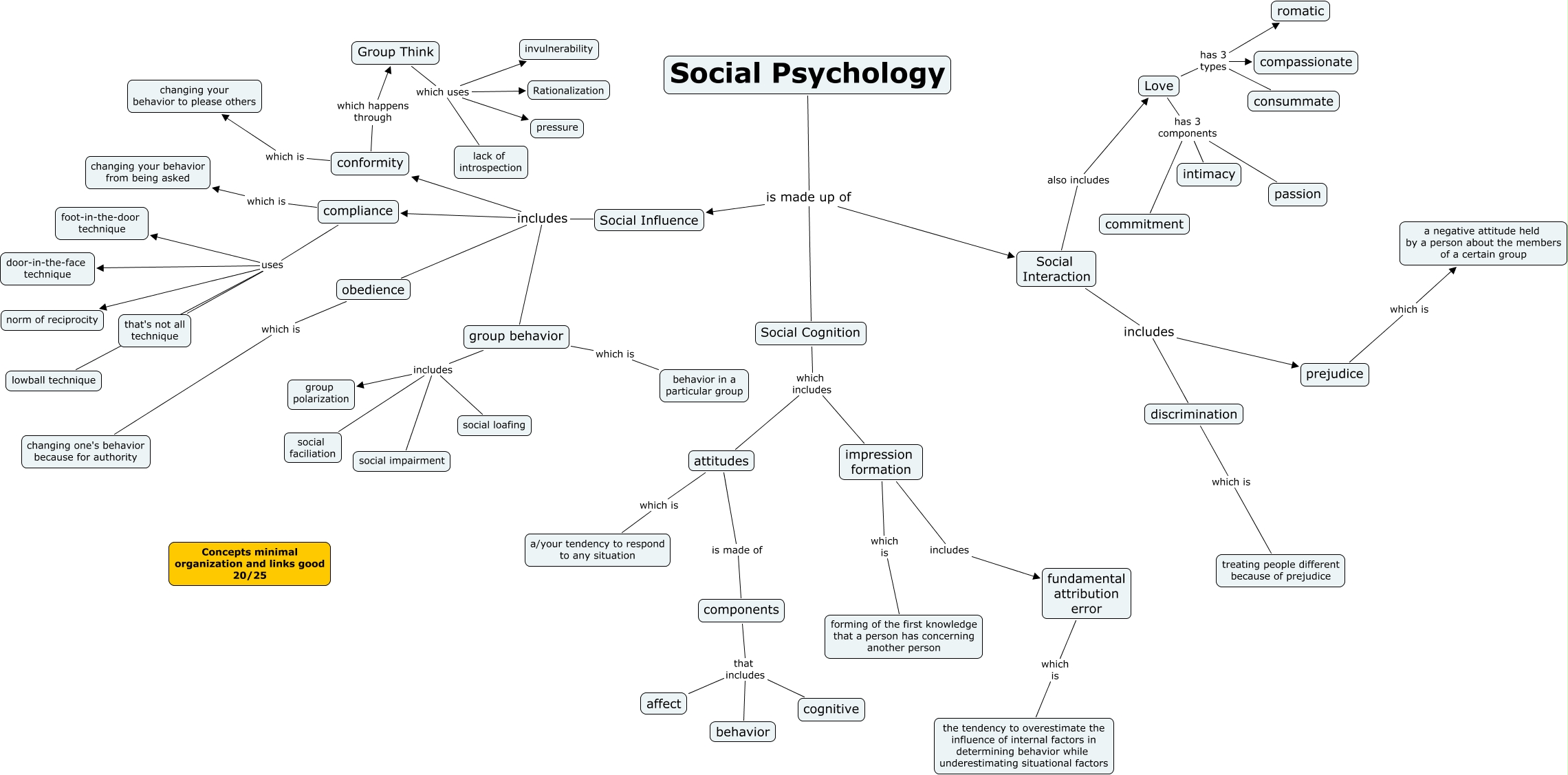 This Concept Map, created with IHMC CmapTools, has information related to: Jessica West Ch 12 20, fundamental attribution error which is the tendency to overestimate the influence of internal factors in determining behavior while underestimating situational factors, compliance uses that's not all technique, components that includes cognitive, group behavior includes social loafing, Social Influence includes group behavior, Social Interaction includes prejudice, discrimination which is treating people different because of prejudice, Love has 3 components commitment, group behavior includes social impairment, Social Psychology is made up of Social Interaction, impression formation which is forming of the first knowledge that a person has concerning another person, Love has 3 components intimacy, components that includes affect, compliance uses door-in-the-face technique, Group Think which uses lack of introspection, compliance which is changing your behavior from being asked, prejudice which is a negative attitude held by a person about the members of a certain group, attitudes which is a/your tendency to respond to any situation, Social Psychology is made up of Social Cognition, obedience which is changing one's behavior because for authority