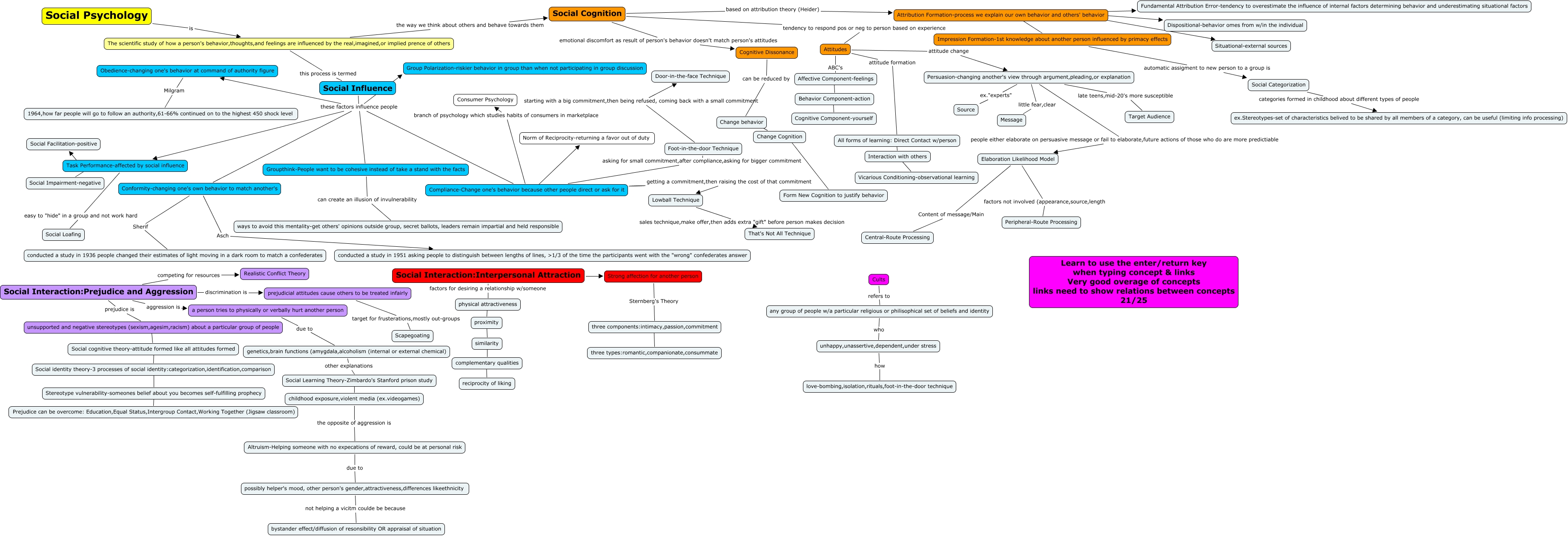 This Concept Map, created with IHMC CmapTools, has information related to: McGranahan-Ch 12 21, Social Interaction:Prejudice and Aggression aggression is a person tries to physically or verbally hurt another person, Task Performance-affected by social influence ???? Social Impairment-negative, Persuasion-changing another's view through argument,pleading,or explanation people either elaborate on persuasive message or fail to elaborate,future actions of those who do are more predictiable Elaboration Likelihood Model, Conformity-changing one's own behavior to match another's Sherif conducted a study in 1936 people changed their estimates of light moving in a dark room to match a confederates, Social identity theory-3 processes of social identity:categorization,identification,comparison ???? Stereotype vulnerability-someones belief about you becomes self-fulfilling prophecy, three components:intimacy,passion,commitment ???? three types:romantic,companionate,consummate, Behavior Component-action ???? Cognitive Component-yourself, Cognitive Dissonance can be reduced by Change behavior, Social Cognition tendency to respond pos or neg to person based on experience Attitudes, Stereotype vulnerability-someones belief about you becomes self-fulfilling prophecy ???? Prejudice can be overcome: Education,Equal Status,Intergroup Contact,Working Together (Jigsaw classroom), any group of people w/a particular religious or philisophical set of beliefs and identity who unhappy,unassertive,dependent,under stress, Compliance-Change one's behavior because other people direct or ask for it getting a commitment,then raising the cost of that commitment Lowball Technique, prejudicial attitudes cause others to be treated infairly target for frusterations,mostly out-groups Scapegoating, childhood exposure,violent media (ex.videogames) the opposite of aggression is Altruism-Helping someone with no expecations of reward, could be at personal risk, Elaboration Likelihood Model factors not involved (appearance,source,length Peripheral-Route Processing, Social Influence these factors influence people Group Polarization-riskier behavior in group than when not participating in group discussion, The scientific study of how a person's behavior,thoughts,and feelings are influenced by the real,imagined,or implied prence of others the way we think about others and behave towards them Social Cognition, Altruism-Helping someone with no expecations of reward, could be at personal risk due to possibly helper's mood, other person's gender,attractiveness,differences likeethnicity, Task Performance-affected by social influence ???? Social Facilitation-positive, Groupthink-People want to be cohesive instead of take a stand with the facts can create an illusion of invulnerability ways to avoid this mentality-get others' opinions outside group, secret ballots, leaders remain impartial and held responsible