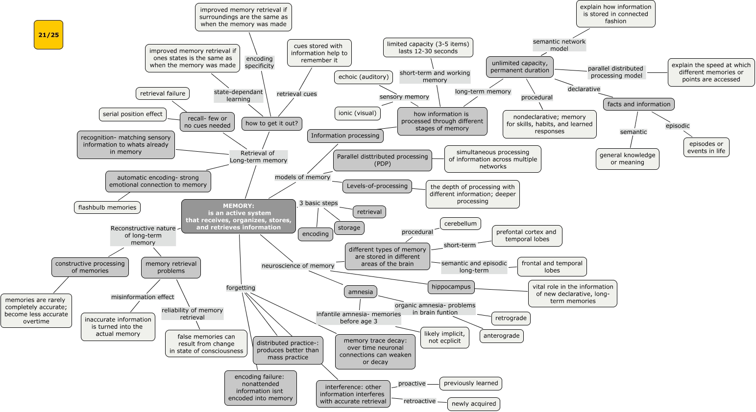 This Concept Map, created with IHMC CmapTools, has information related to: ch 6 Lindsay Resmondo 21, how to get it out? retrieval cues cues stored with information help to remember it, how to get it out? encoding specificity improved memory retrieval if surroundings are the same as when the memory was made, different types of memory are stored in different areas of the brain procedural cerebellum, MEMORY: is an active system that receives, organizes, stores, and retrieves information Retrieval of Long-term memory how to get it out?, MEMORY: is an active system that receives, organizes, stores, and retrieves information neuroscience of memory different types of memory are stored in different areas of the brain, interference: other information interferes with accurate retrieval retroactive newly acquired, MEMORY: is an active system that receives, organizes, stores, and retrieves information models of memory Levels-of-processing, unlimited capacity, permanent duration declarative facts and information, how information is processed through different stages of memory sensory memory ionic (visual), amnesia infantile amnesia- memories before age 3 likely implicit, not ecplicit, MEMORY: is an active system that receives, organizes, stores, and retrieves information forgetting encoding failure: nonattended information isnt encoded into memory, how to get it out? state-dependant learning improved memory retrieval if ones states is the same as when the memory was made, unlimited capacity, permanent duration parallel distributed processing model explain the speed at which different memories or points are accessed, interference: other information interferes with accurate retrieval proactive previously learned, MEMORY: is an active system that receives, organizes, stores, and retrieves information models of memory Information processing, amnesia organic amnesia- problems in brain funtion retrograde, MEMORY: is an active system that receives, organizes, stores, and retrieves information 3 basic steps retrieval, MEMORY: is an active system that receives, organizes, stores, and retrieves information Retrieval of Long-term memory recall- few or no cues needed, MEMORY: is an active system that receives, organizes, stores, and retrieves information Retrieval of Long-term memory recognition- matching sensory information to whats already in memory, recall- few or no cues needed ???? serial position effect