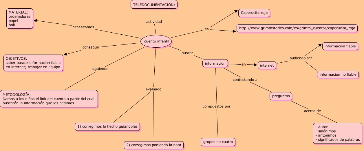 Este Cmap, tiene información relacionada con: cuento tic.cmap, cuento infantil es Caperucita roja, información contestando a preguntas, internet pudiendo ser informacion no fiable, cuento infantil buscar información, internet pudiendo ser informacion fiable, información compuestos por grupos de cuatro, información en internet, cuento infantil siguiendo METODOLOGÍA: Damos a los niños el link del cuento a partir del cual buscarán la información que les pedimos., cuento infantil necesitamos MATERIAL: ordenadores papel boli, preguntas acerca de - Autor - sinónimos - antónimos - significados de palabras, cuento infantil evaluado 2) corregimos poniendo la nota, cuento infantil es http://www.grimmstories.com/es/grimm_cuentos/caperucita_roja, cuento infantil conseguir OBJETIVOS: saber buscar información fiable en internet; trabajar en equipo, cuento infantil evaluado 1) corregimos lo hecho guiandoles, TELEDOCUMENTACIÓN: actividad cuento infantil