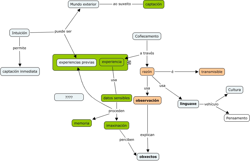 Este Cmap, tiene información relacionada con: Mapa conceptual para completar, datos sensibles proceden memoria, experiencia usa datos sensibles, observación explican obxectos, Intuición puede ser Mundo exterior, Coñecemento a través experiencia, Mundo exterior ao suxeito captación, linguaxe vehículo Pensamento, datos sensibles proceden experiencias previas, datos sensibles proceden imaxinación, linguaxe vehículo Cultura, Intuición puede ser experiencias previas, Coñecemento a través razón, razón é transmisible, razón usa observación, razón usa linguaxe, imaxinación perciben obxectos, Intuición permite captación inmediata