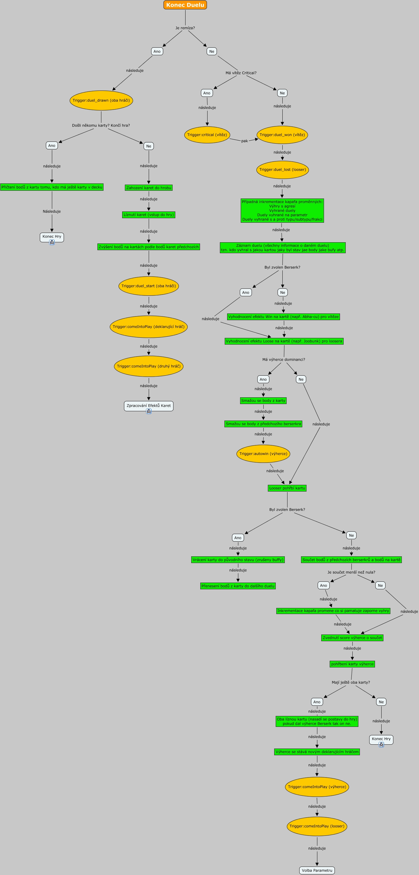 Tato Cmapa, vytvořená pomocí CmapTools, obsahuje informaci související s: Konec Duelu, Konec Duelu Je remíza? Ne, Oba líznou kartu (nasadí se postavy do hry) pokud dal výherce Berserk tak on ne. následuje Výherce se stává novým deklarujícím hráčem, Ano následuje Inkrementace kapafa promene co si pamatuje zaporne vyhry, Ne následuje Vyhodnocení efektu Win na kartě (např. Abha-cu) pro vítěze, Trigger:comeIntoPlay (druhý hráč) následuje Zpracování Efektů Karet, Vyhodnocení efektu Loose na kartě (např. Joobunk) pro loosera Má výherce dominanci? Ano, Ne Má vítěz Critical? Ano, Trigger:autowin (výherce) následuje Looser pohřbí kartu, Ne Má vítěz Critical? Ne, Trigger:duel_drawn (oba hráči) Došli někomu karty? Končí hra? Ne, Inkrementace kapafa promene co si pamatuje zaporne vyhry následuje Zvednutí score výherce o součet, Zvýšení bodů na kartách podle bodů karet předchozích následuje Trigger:duel_start (oba hráči), Ano následuje Smažou se body z karty, Ne následuje Looser pohřbí kartu, Trigger:comeIntoPlay (deklarující hráč) následuje Trigger:comeIntoPlay (druhý hráč), Trigger:duel_lost (looser) následuje Případná inkrementace kapafa proměnných: Výhry s agresí Vyhrané duely Duely vyhrané na parametr Duely vyhrané s a proti typu/subtypu/frakci, Součet bodů z předchozích berserkrů a bodů na kartě Je součet menší než nula? Ano, Ano následuje Přičtení bodů z karty tomu, kdo má ještě karty v decku, Vyhodnocení efektu Loose na kartě (např. Joobunk) pro loosera Má výherce dominanci? Ne, pohřbení karty výherce Mají ještě oba karty? Ne