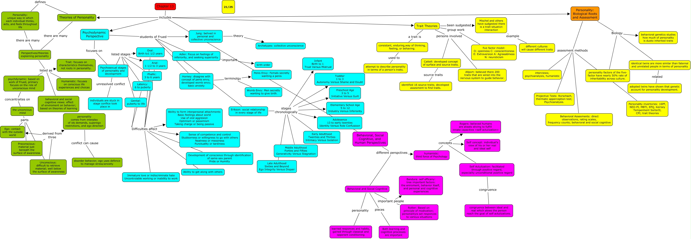This Concept Map, created with IHMC CmapTools, has information related to: Ch 13 Jones 21, Adler: Focus on feelings of inferiority, and seeking superiority important birth order, Chapter 13 includes Personality: Biological Roots and Assessment, Anal: 1 1/2 to 3 years Difficulties affect Development of conscience through identification of same-sex parent Pride or Humilty, Latency: 6 to puberty Difficulties affect Ability to form interpersonal attachments Basic feelings about world Use of oral aggresion Optimism or pessimism Taking charge or being passive, Self Actulization: facilitated through positive regard, especiallly unconditional positive regard congruence congruence between ideal and real which alows the person reach the goal of self actulizations., Latency: 6 to puberty Difficulties affect Ability to get along with others, psychdynamic: based on work of Frued, primary focusis on the role of unconscious mind concentraites on the unconcious mind, Unconscious: difficult to retrieve material; well below the surface of awareness derived from three personality comes from interplay of ids demands, superego restrictions, and ego direction, Anal: 1 1/2 to 3 years Difficulties affect Immature love or indiscriminate hate Uncontrolable working or inability to work, consistant, enduring,way of thinking, feeling, or behaving. used to attempt to describe personality in terms of a person's traits., the unconcious mind parts Ego: contact with the outside world, identical twins are more similar than faternal and unrelated people in terms of personality related adopted twins have shown that genetic account for personality development., Psychodynamic Perspective focuses on Psychosexual stages of personality and development, Psychodynamic Perspective students of Frued Jung: belived in personal and collective unconscience, Perspectives/theories explaining personality listed as behavioral and social cognitive views: effect of enviroment on behavior; based on theories of learning, Personality: Biological Roots and Assessment Biology personality factors of the five- factor have nearly 50% rate of inheritability across culture., Oral: Birth to1 1/2 years Difficulties affect Immature love or indiscriminate hate Uncontrolable working or inability to work, Psychosexual stages of personality and development listed stages Genital: puberty to life, Unconscious: difficult to retrieve material; well below the surface of awareness derived from three Preconscious: material just beneath the surface of awareness, Perspectives/theories explaining personality listed as psychdynamic: based on work of Frued, primary focusis on the role of unconscious mind