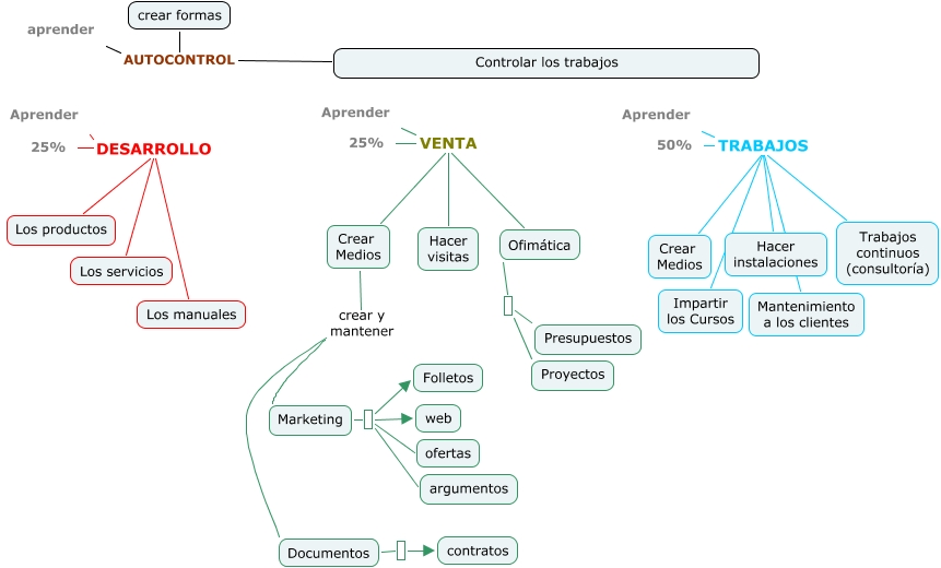 Este Cmap, tiene información relacionada con: Secciones de trabajo general, Aprender VENTA Ofimática, Aprender TRABAJOS Impartir los Cursos, Aprender DESARROLLO Los servicios, Aprender TRABAJOS Hacer instalaciones, Crear Medios crear y mantener Marketing, Ofimática Presupuestos, Aprender TRABAJOS Trabajos continuos (consultoría), Aprender TRABAJOS Crear Medios, Aprender VENTA Crear Medios, Crear Medios crear y mantener Documentos, Marketing Folletos, Aprender DESARROLLO Los manuales, Aprender TRABAJOS Mantenimiento a los clientes, Marketing ofertas, Marketing argumentos, Aprender VENTA Hacer visitas, Controlar los trabajos AUTOCONTROL aprender, Aprender TRABAJOS 50%, Aprender DESARROLLO Los productos, Marketing web