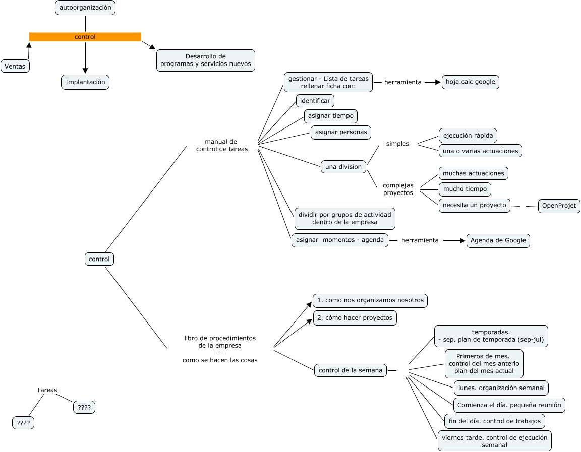 Este Cmap, tiene información relacionada con: 3. control de tareas, control de la semana viernes tarde. control de ejecución semanal, control manual de control de tareas gestionar - Lista de tareas rellenar ficha con:, asignar momentos - agenda herramienta Agenda de Google, control de la semana lunes. organización semanal, control libro de procedimientos de la empresa --- como se hacen las cosas 1. como nos organizamos nosotros, control manual de control de tareas asignar tiempo, Ventas control Desarrollo de programas y servicios nuevos, control libro de procedimientos de la empresa --- como se hacen las cosas 2. cómo hacer proyectos, una division simples ejecución rápida, control de la semana Primeros de mes. control del mes anterio plan del mes actual, una division complejas proyectos necesita un proyecto, una division complejas proyectos muchas actuaciones, autoorganización control Desarrollo de programas y servicios nuevos, control de la semana fin del día. control de trabajos, control manual de control de tareas dividir por grupos de actividad dentro de la empresa, necesita un proyecto OpenProjet, ???? Tareas ????, control manual de control de tareas asignar personas, control manual de control de tareas una division, una division simples una o varias actuaciones