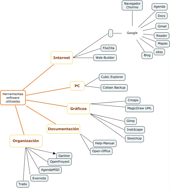 Este Cmap, tiene información relacionada con: Herramientos-EsqGeneral, Herramientas software utilizadas Organización Gantter, Herramientas software utilizadas Organización OpenProyect, Google Gmail, Herramientas software utilizadas Gráficos MagicDraw UML, Herramientas software utilizadas Gráficos Cmaps, Herramientas software utilizadas Gráficos Gimp, Herramientas software utilizadas Documentación Open-Office, Google Mapas, Herramientas software utilizadas Organización Trello, Google Reader, Herramientas software utilizadas Documentación Help-Manual, Google Navegador Chorme, Herramientas software utilizadas PC Cobian Backup, Google Agenda, Herramientas software utilizadas Internet, Herramientas software utilizadas Organización AgendaMSD, Herramientas software utilizadas Internet FileZilla, Herramientas software utilizadas Gráficos InskScape, Google sites, Google Docs
